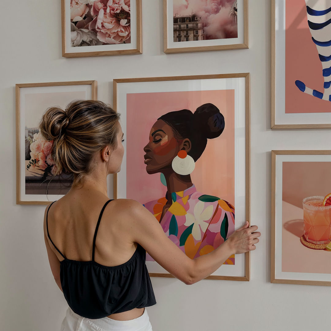 Ta grafika ścienna łączy wyraziste kolory i delikatne odcienie różu, tworząc hipnotyzujące doznania wizualne. Kompozycja tych plakatów tworzy rytmiczny przepływ między miejskimi krajobrazami, kwiatowymi wzorami, kotami, napojami i eleganckim stylem. Rezultatem jest ciepła i przyjazna atmosfera, która przekształca każde pomieszczenie w inspirującą galerię o bogatym ładunku emocjonalnym.