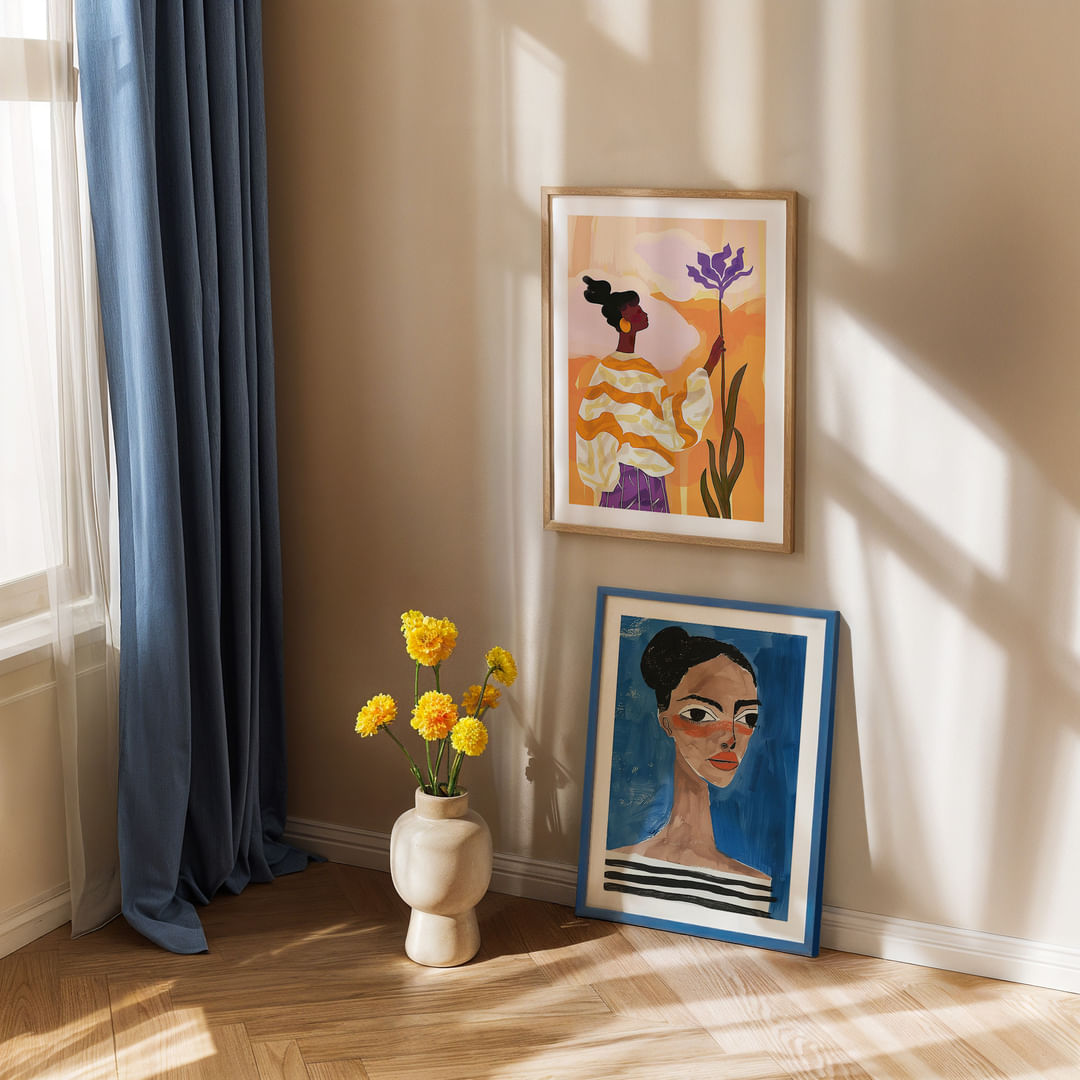 Ta grafika ścienna łączy żywą paletę barw z harmonijnymi motywami, które razem tworzą dynamiczną, a zarazem uspokajającą całość. Dzięki żywym kolorom i wyrazistym postaciom, plakaty te podkreślają zarówno indywidualność, jak i spójność, stanowiąc elegancki i wyrafinowany dodatek do każdego wnętrza. Całość tworzy grę kontrastów, która pogłębia wnętrze i tworzy stymulującą atmosferę.