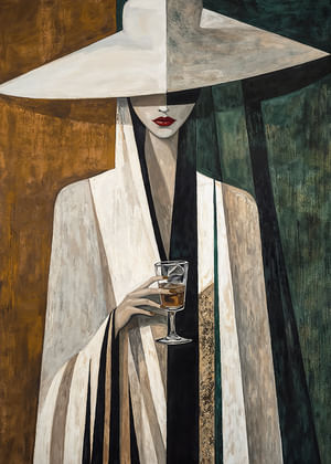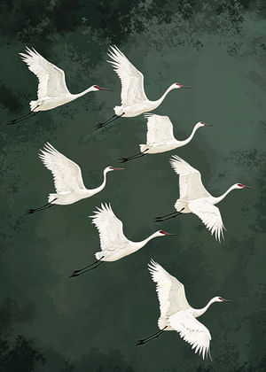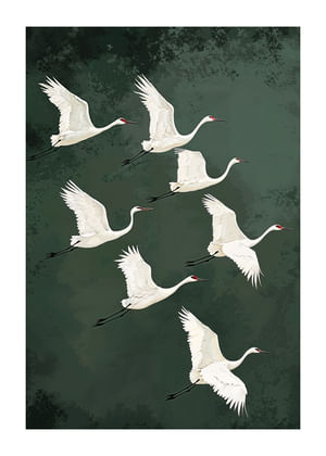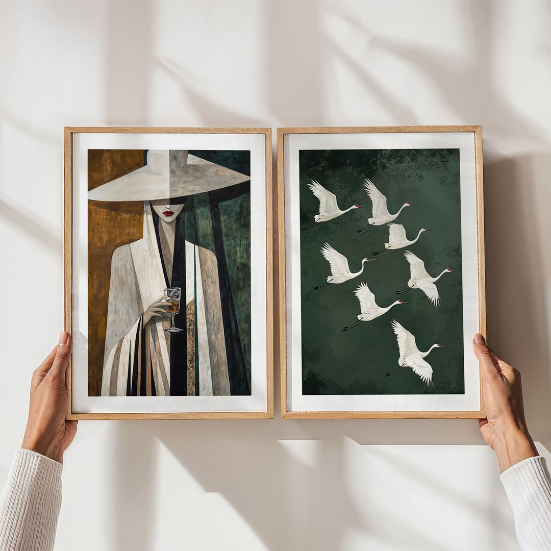 Ta kompozycja plakatów oddaje poczucie spokoju i piękna dzięki swojemu artystycznemu projektowi. Po lewej stronie widzimy postać w tradycyjnym stroju, który emanuje tajemnicą, podczas gdy po prawej stronie ukazuje wdzięczne ptaki w locie na delikatnym, zielonym tle. Harmonijny kontrast plakatu tworzy wyjątkową równowagę, przekształcając każde pomieszczenie w przestrzeń spokoju i elegancji, idealną dla miłośników kolekcji Japandi.
