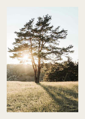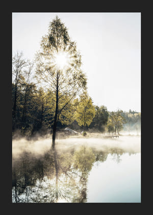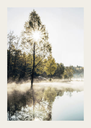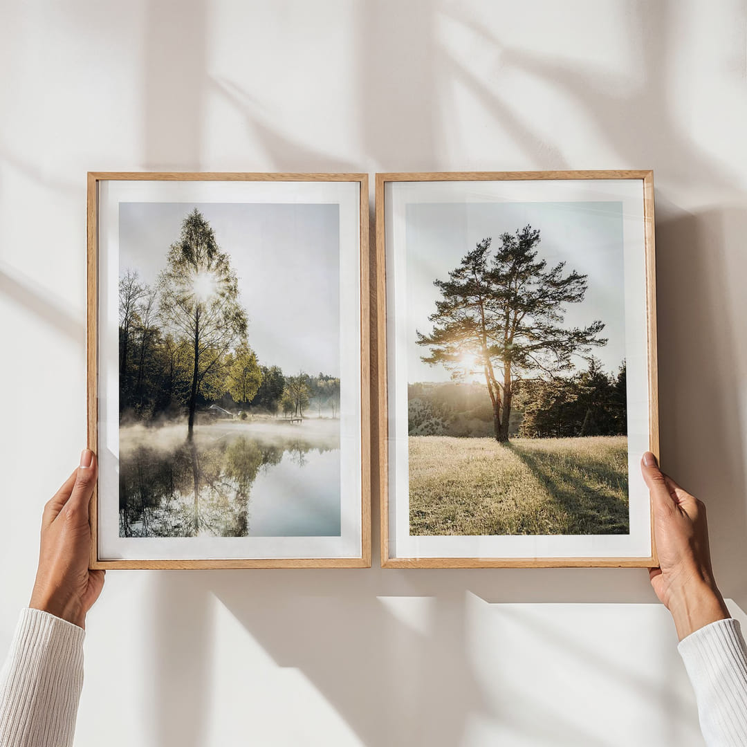 Te plakaty przedstawiają dwa krajobrazy w spokojnym, porannym świetle. Po lewej stronie drzewo odbija się w jeziorze, gdzie promienie słońca przebijają się przez mgłę, a po prawej stronie samotne drzewo na rozświetlonej słońcem łące. Połączenie światła i natury tworzy kojące wrażenie, idealne do podkreślenia spokojnej atmosfery w Twoim domu. Ten plakat będzie elementem uspokajającym, dodającym harmonii i stylu.