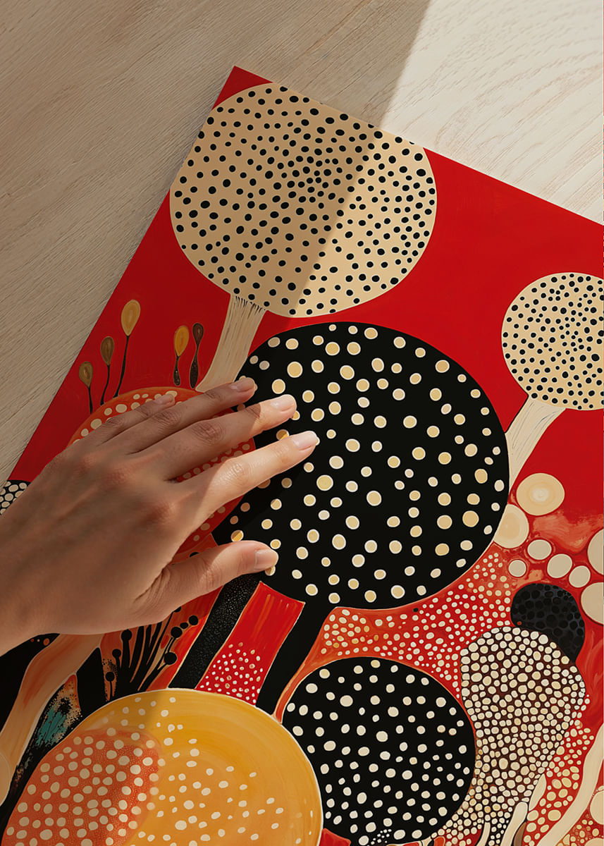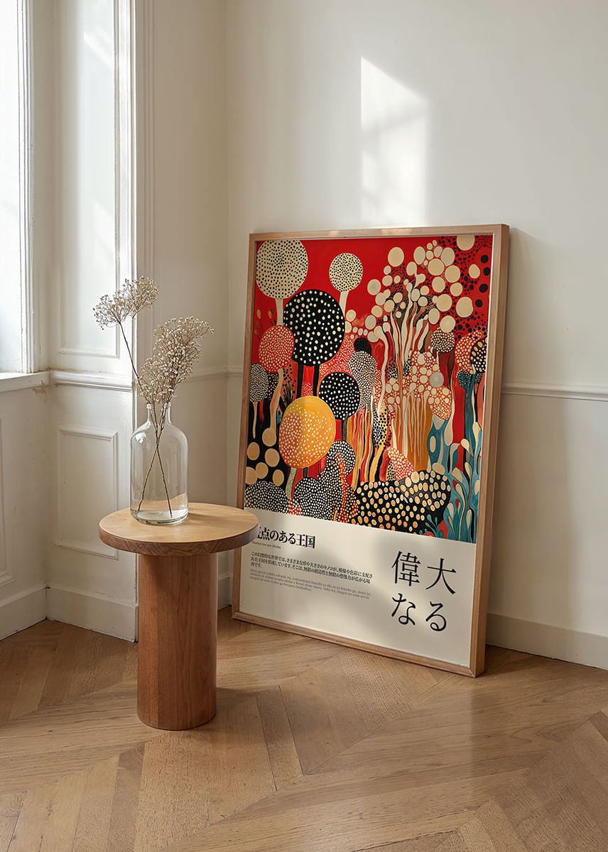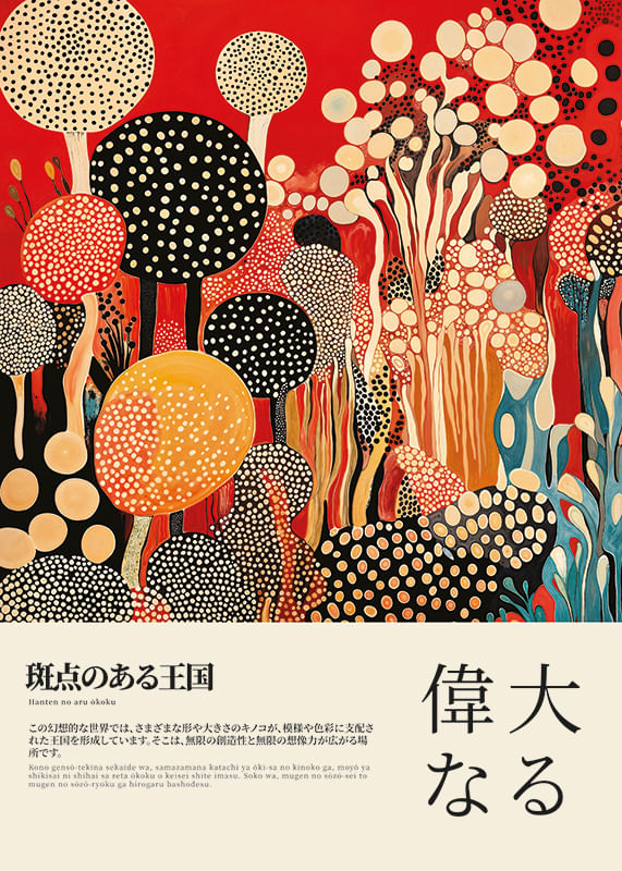 Plakat japoński inspirowany japońską artystką Yayoi Kusamą. Plakat zachwyca pomysłowym krajobrazem przedstawiającym grzyby o różnych kształtach i kolorach na odważnym, czerwonym tle. Rytm kropek i intensywność kolorów wywołują wrażenie ruchu i tajemniczości, jakby magia natury ożywała.