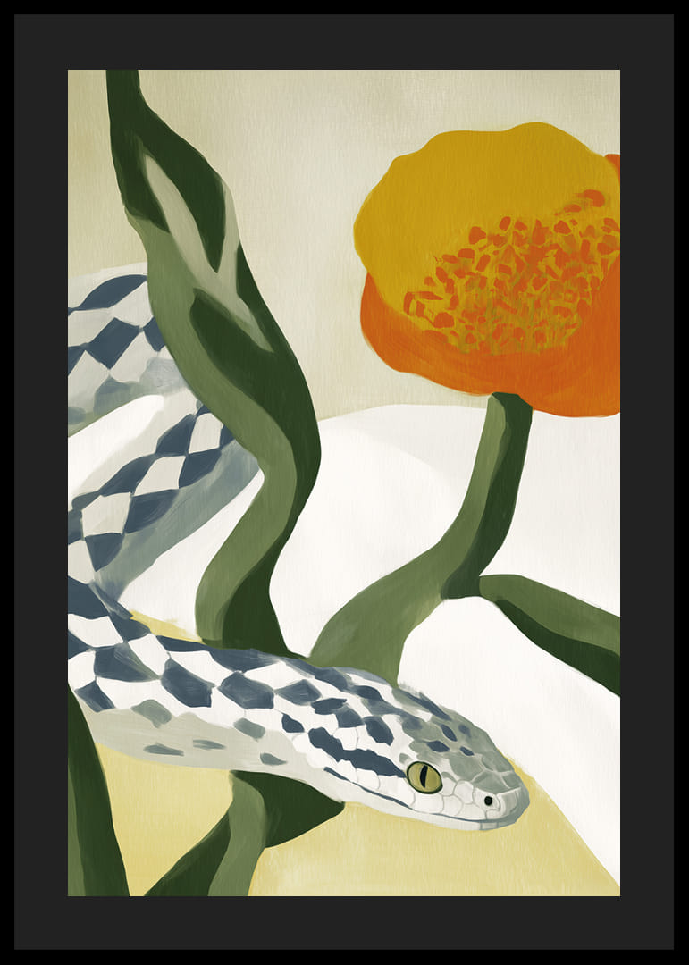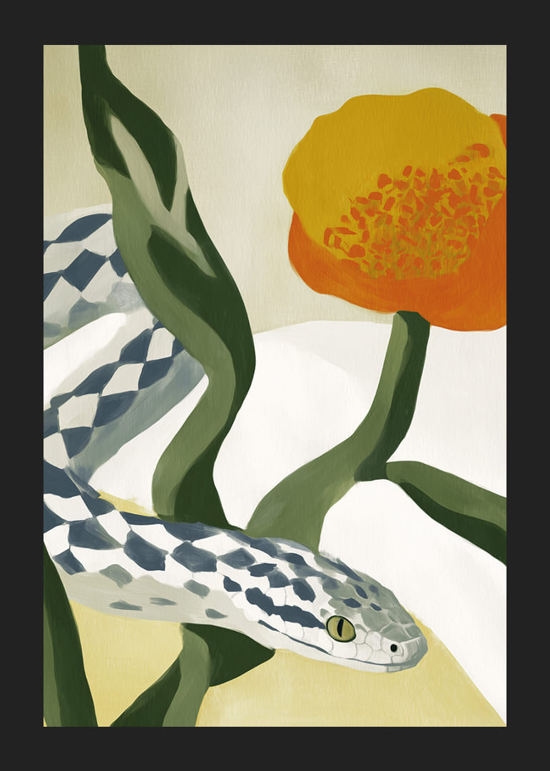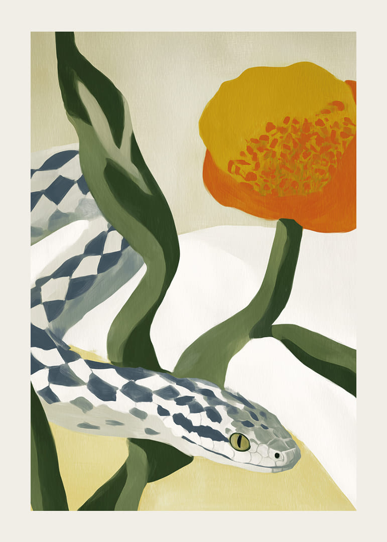Ten plakat oddaje elegancję harmonii natury z wężem wijącym się wśród falujących liści i delikatnych kwiatów w ciepłych, ziemistych kolorach. Miękkie linie i wzór węża tworzą wizualną poezję, która hipnotyzuje i uspokaja. Umieść go w swoim salonie, aby dodać odrobinę dzikiego, naturalnego piękna i odmienić atmosferę dzięki jego subtelnej sile.