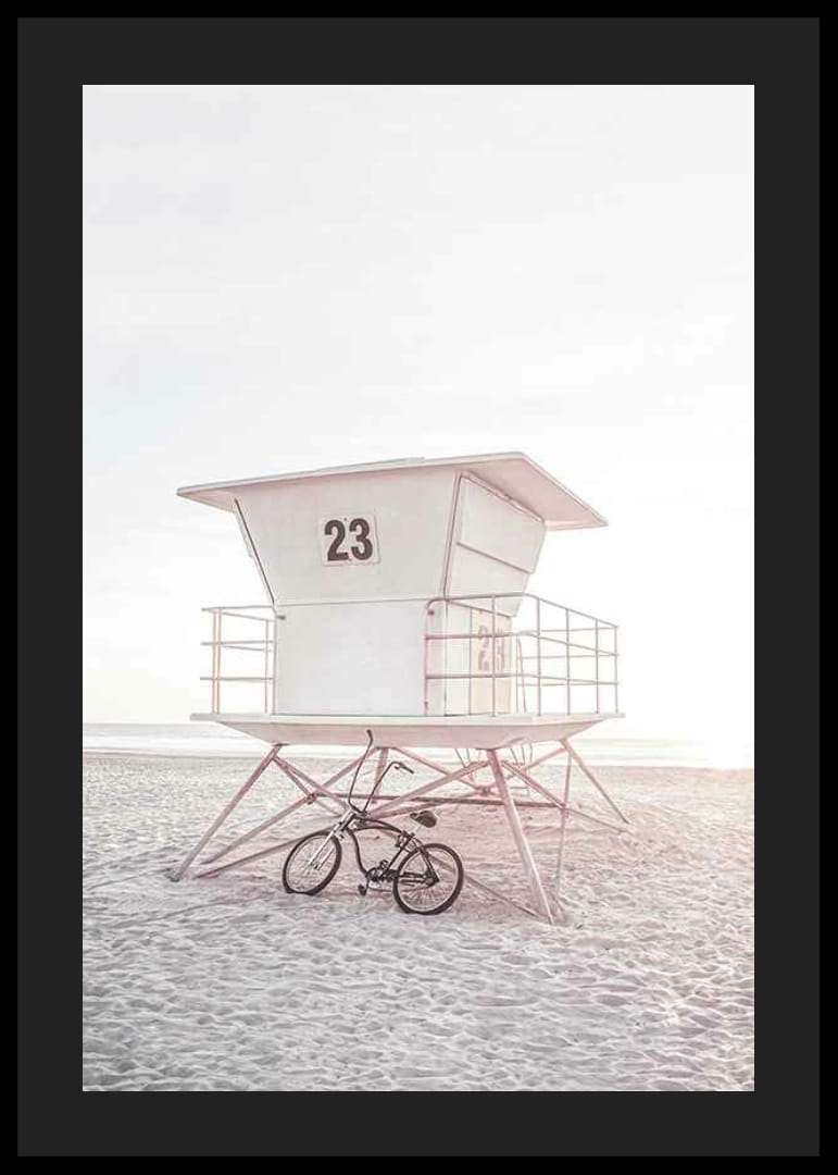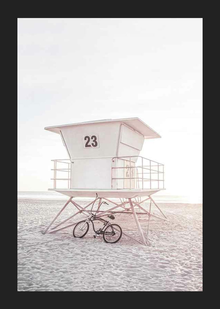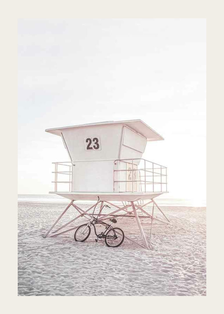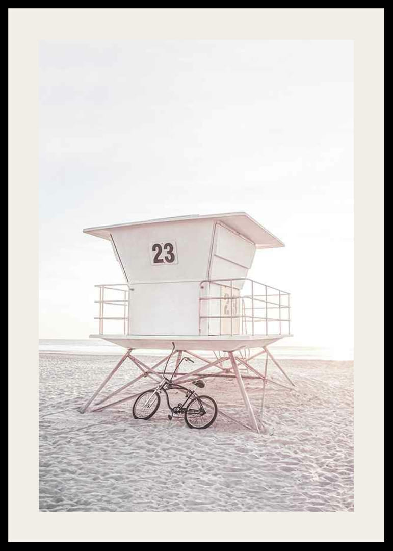 Plakat przedstawiający białą wieżę ratunkową z numerem 23, stojącą na jasnej, piaszczystej plaży w delikatnym, niemal pastelowym świetle. Rower stoi obok stalowych nóg wieży, a w tle widać morze. Plakat ten nadaje lekki i letni charakter, na przykład salonowi lub domowemu gabinetowi.