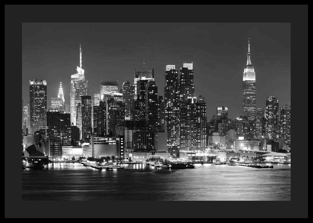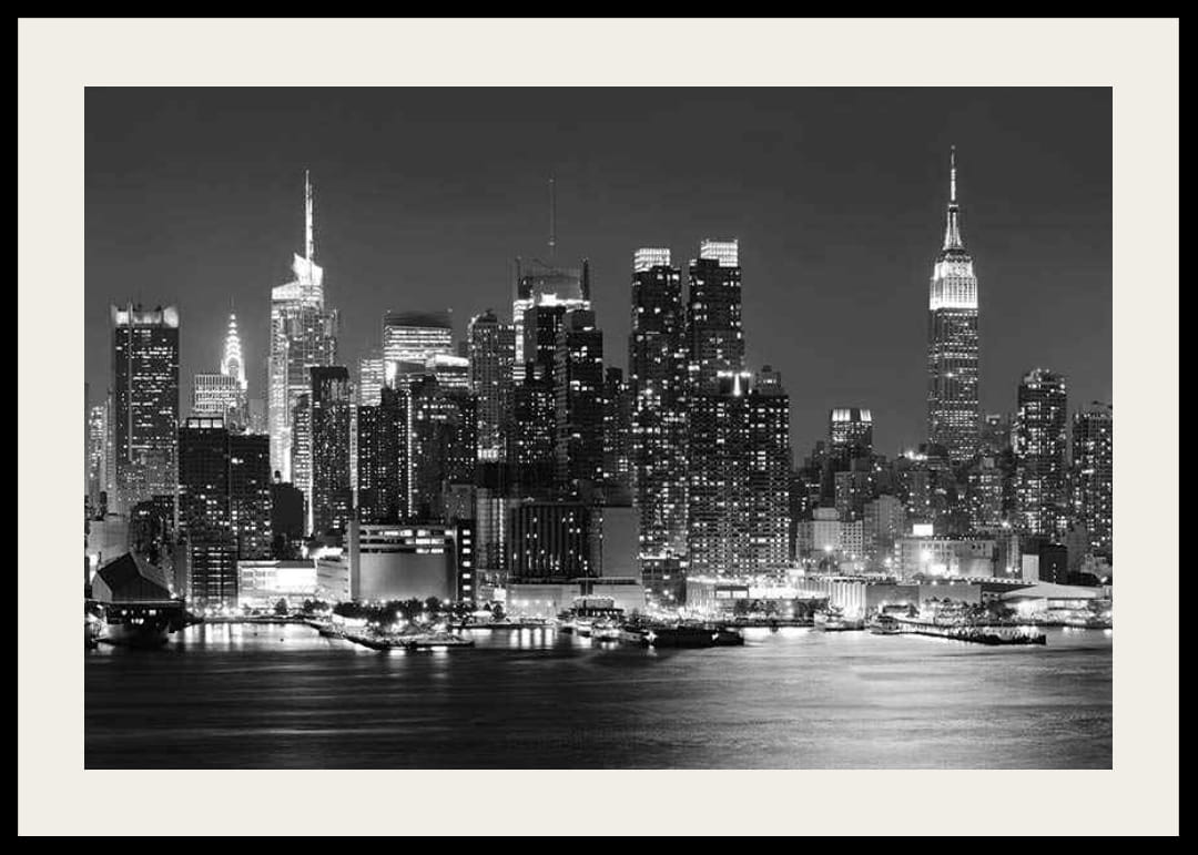 Rozświetlone wieżowce wznoszą się na tle nocnego nieba, tworząc ikoniczną sylwetkę nowojorskiego Manhattanu. Odbicia świateł miasta mienią się w wodzie na pierwszym planie, nadając motywowi graficzny rytm. Czarno-biała kolorystyka sprawia, że plakat jest ponadczasowy i łatwo go dopasować do różnych stylów wnętrz, zarówno w salonach, jak i biurach.