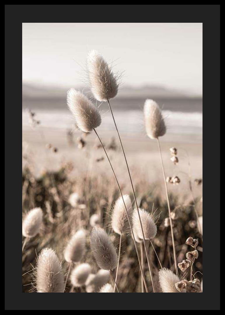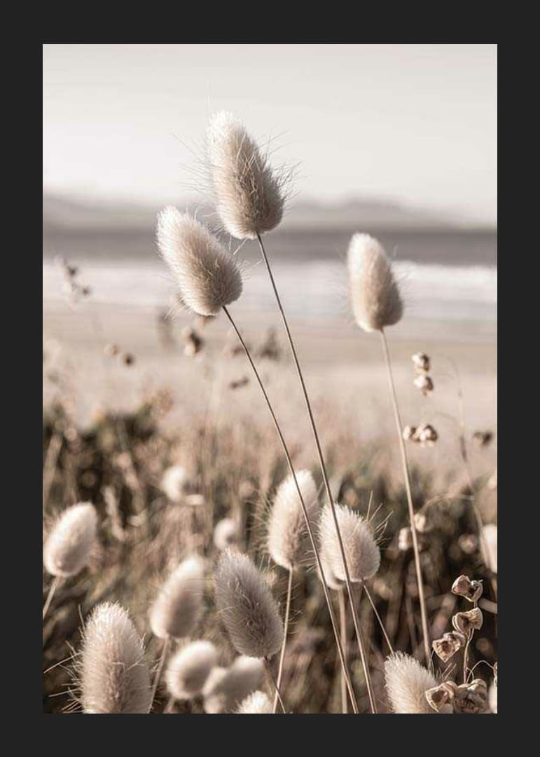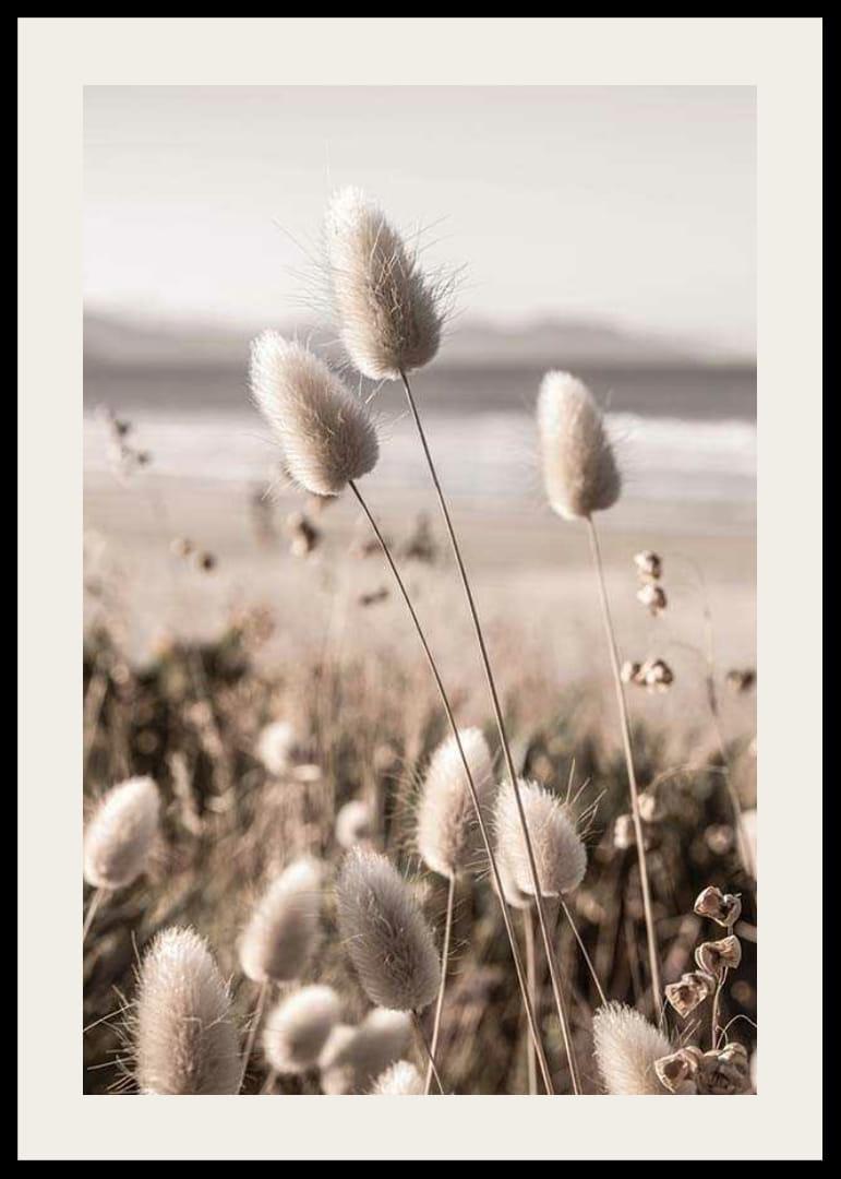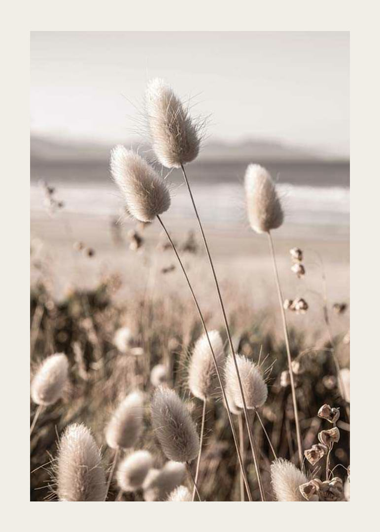 Długie, puszyste źdźbła trawy wyłaniają się na tle rozmytego morza i wydm. Naturalne odcienie beżu i brązu nadają motywowi miękkości, a światło wydobywa detale z rozmytych źdźbeł. Ten plakat ma surowy, późnoletni motyw, który doskonale sprawdzi się w salonie lub sypialni, nadając jej naturalny charakter.