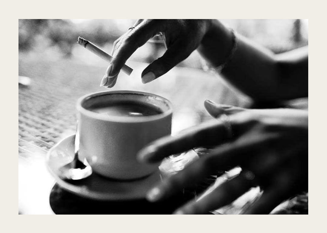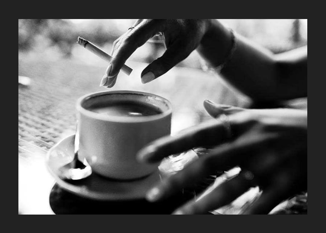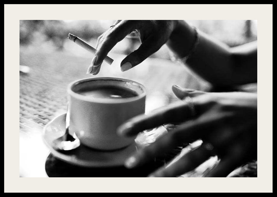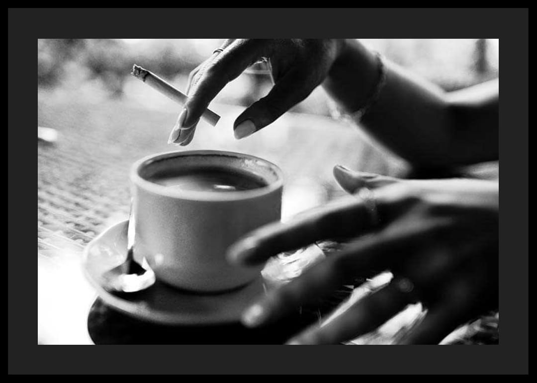 Czarno-białe zbliżenie dłoni trzymającej papierosa nad filiżanką kawy na stoliku kawiarnianym. Delikatne kontrasty oddają spokój chwili, a tło jest lekko rozmyte, aby podkreślić obiekt. Ten plakat idealnie nadaje się do kuchni lub przestrzeni towarzyskich w stylu vintage lub retro.