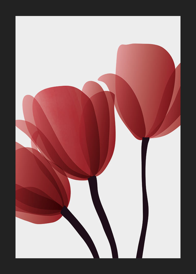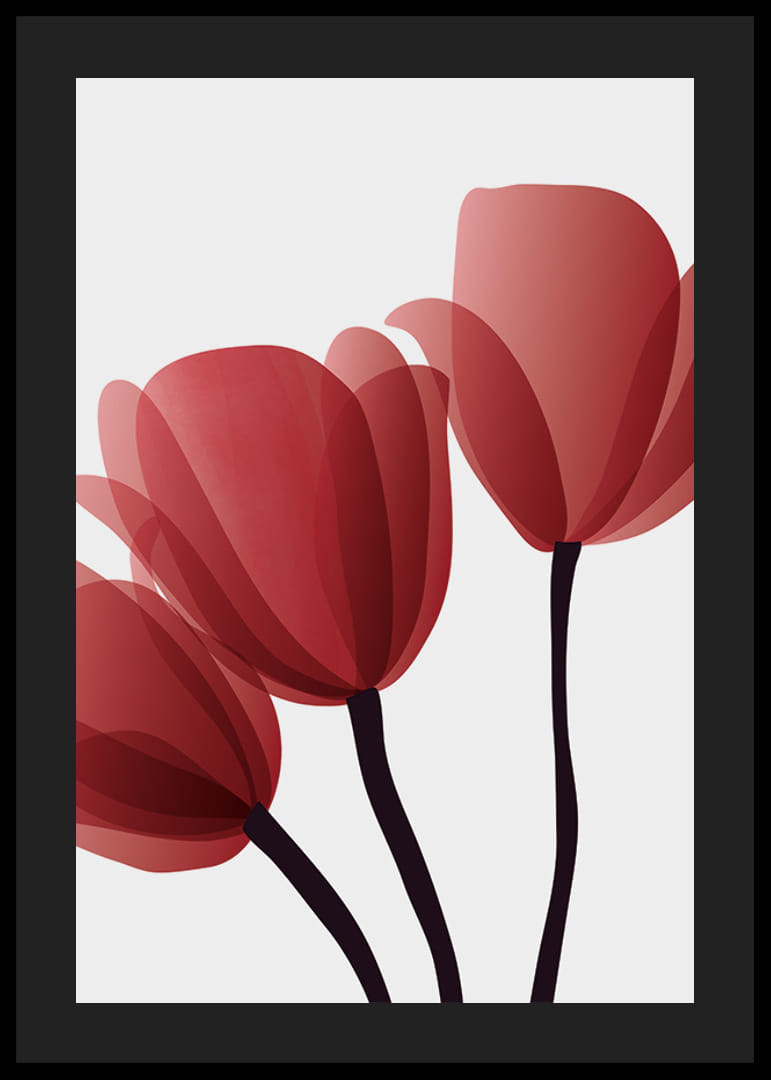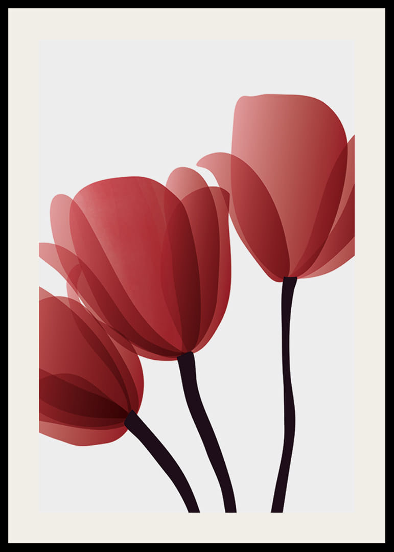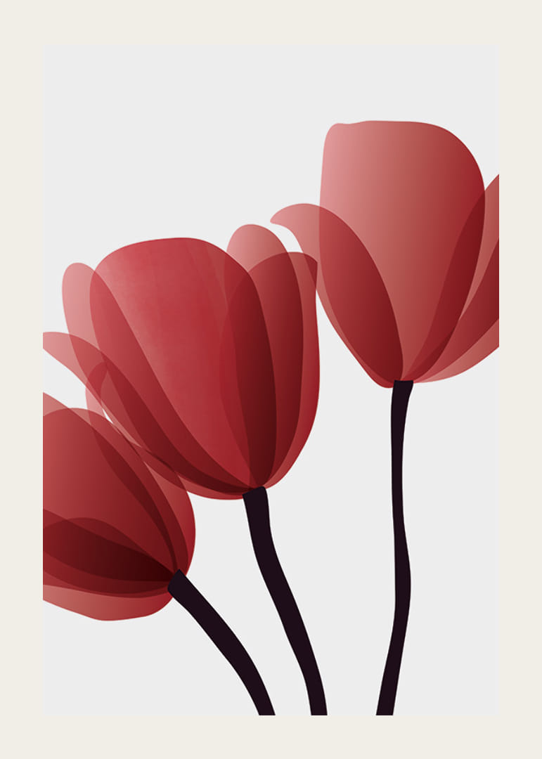 Motyw przedstawia trzy czerwone tulipany z przezroczystymi, zachodzącymi na siebie płatkami i ciemnymi łodygami na jasnoszarym tle. Minimalistyczny styl graficzny nadaje plakatowi nowoczesny charakter, który pasuje do każdego wnętrza, od salonów po gabinety. To prosty, ale wyrazisty element wnętrza.