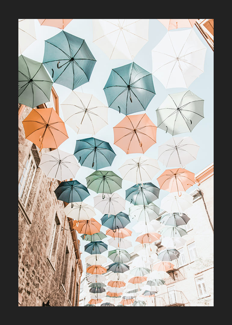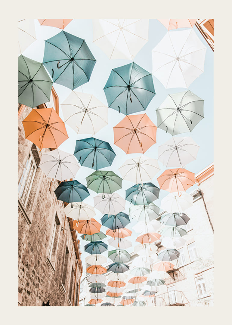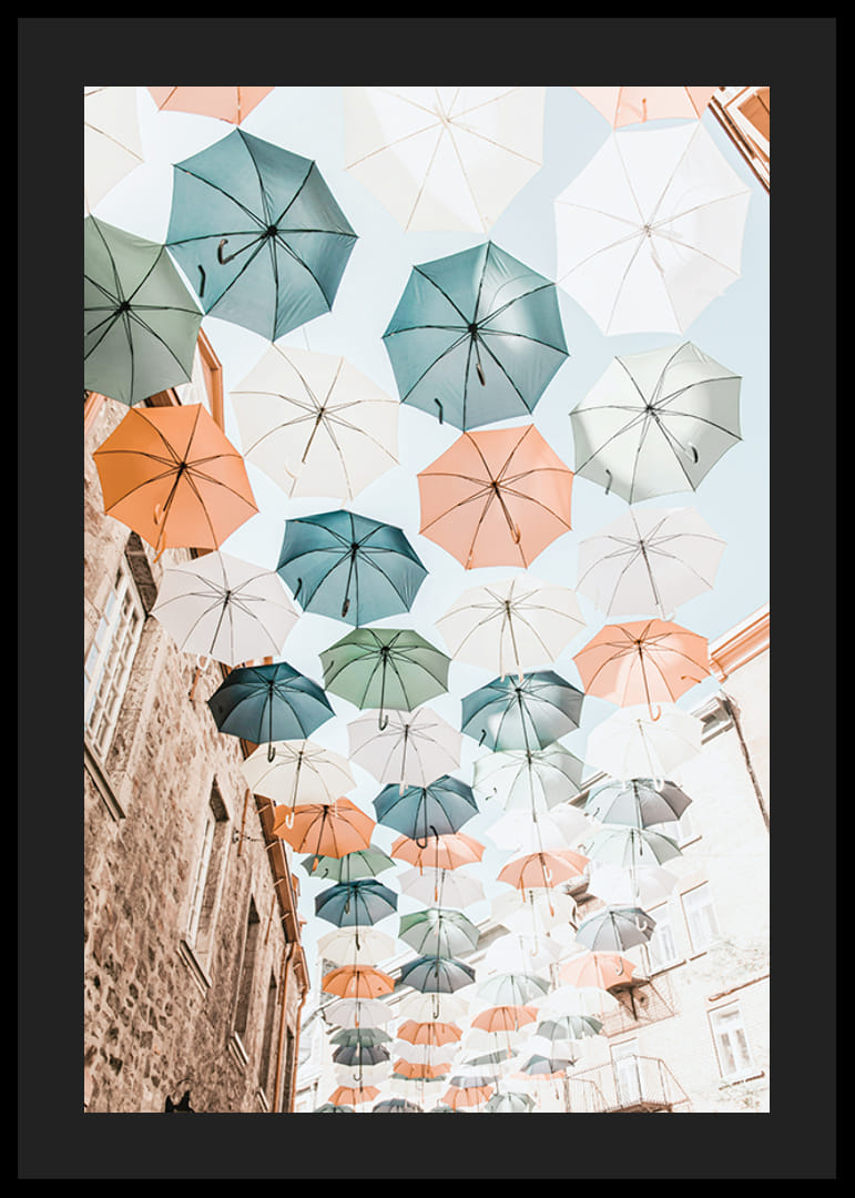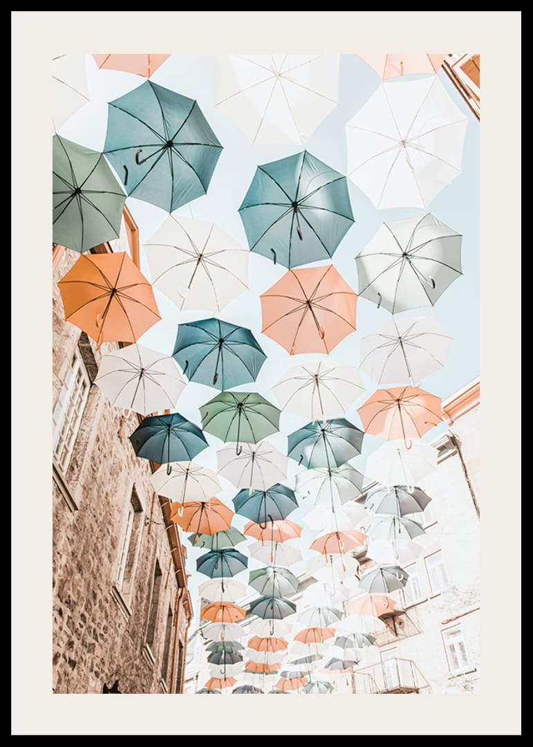 Kilka rzędów parasoli w stonowanych odcieniach błękitu, zieleni, bieli i pomarańczu wisi nad wąską miejską ulicą z kamiennymi domami. Jasne niebo i stonowana paleta barw tworzą wrażenie świeżości i lekkości. Ten plakat nadaje wnętrzu radosny, wiosenny charakter i idealnie nadaje się do przedpokoju lub salonu.