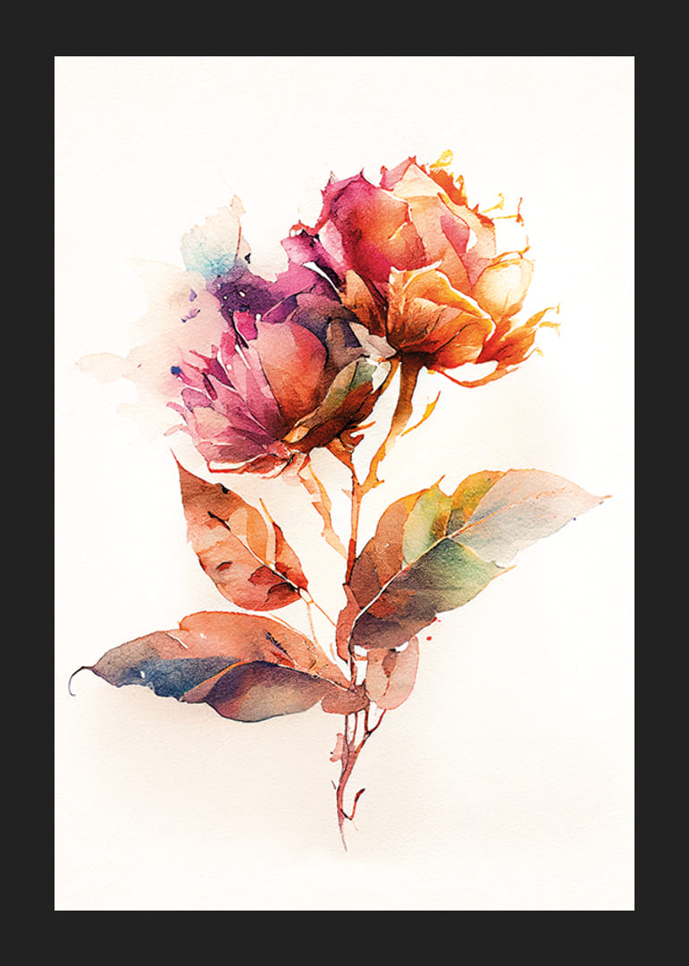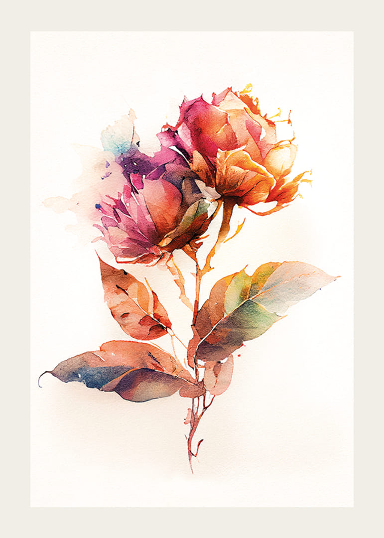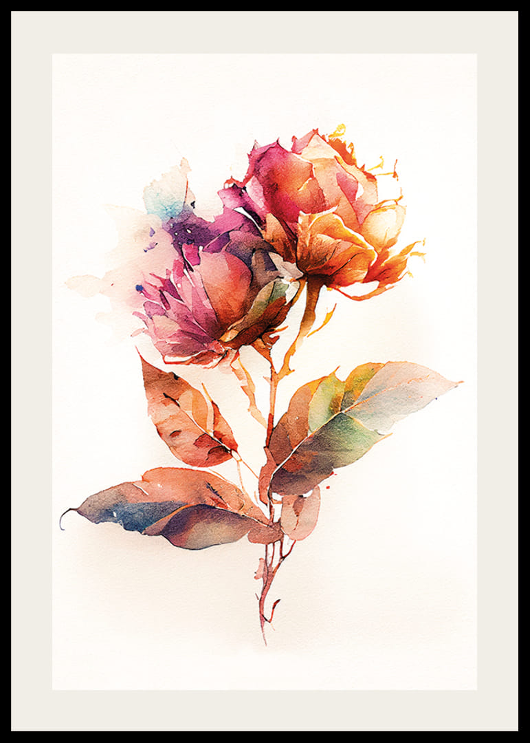 Dwa kwiaty w ciepłych odcieniach czerwieni, pomarańczu i fioletu, przedstawione w stylu akwarelowym, z zielonymi i brązowymi liśćmi na jasnym tle. Motyw charakteryzuje się zwiewną kompozycją, w której kolory przenikają się, tworząc żywą ekspresję. Plakat ten ma artystyczny charakter i doskonale pasuje zarówno do salonu, jak i sypialni.