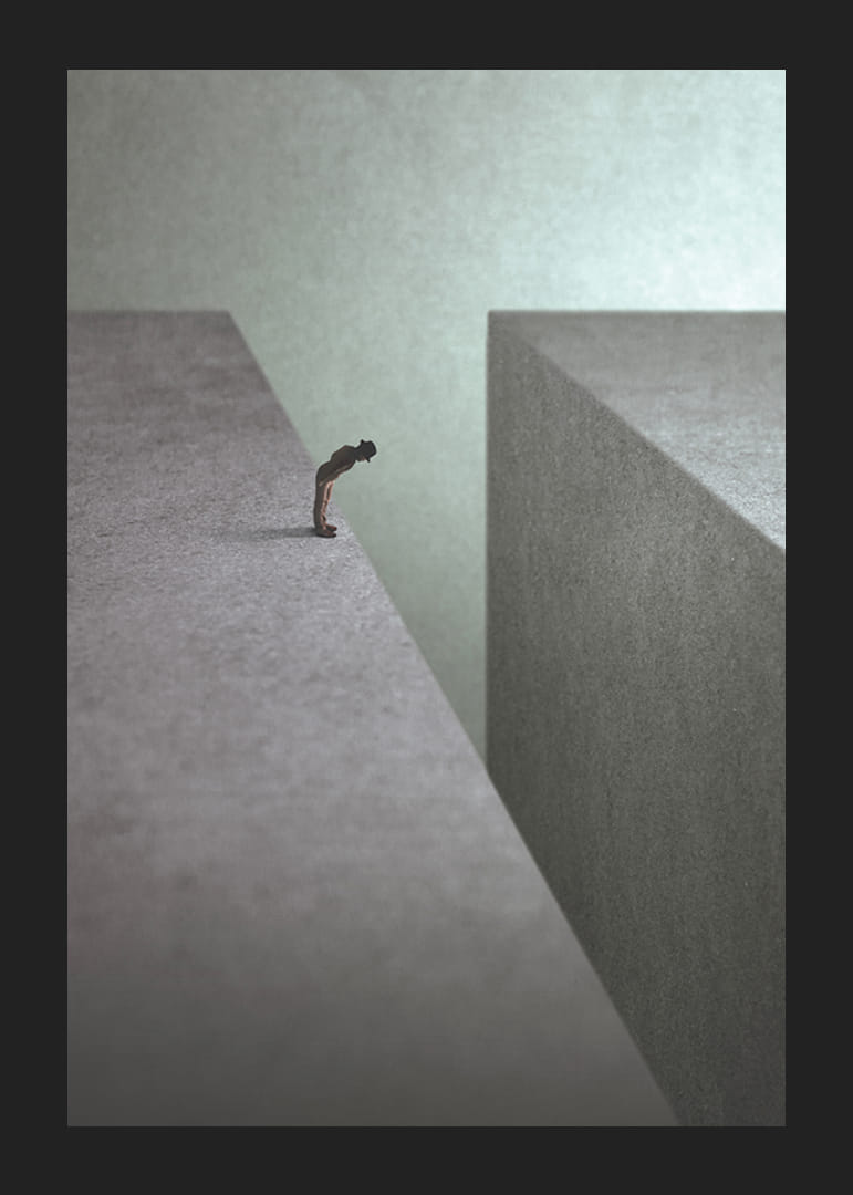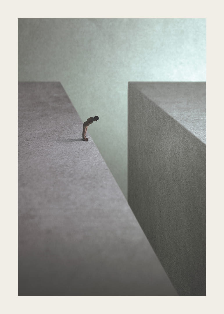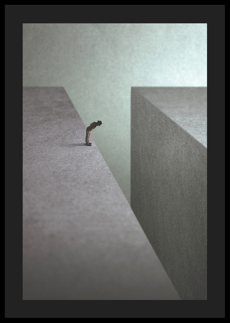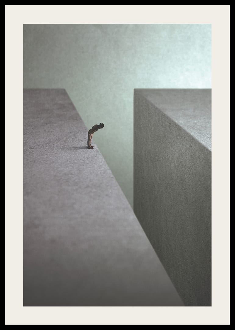 Samotna postać stoi na skraju ogromnego, szarego klifu, wpatrując się w głęboką pustkę. Proste i stonowane kształty nadają motywowi koncepcyjny i melancholijny charakter. Dzięki neutralnym kolorom plakat ten pasuje do nowoczesnych wnętrz, w których pożądana jest stylowa abstrakcja.