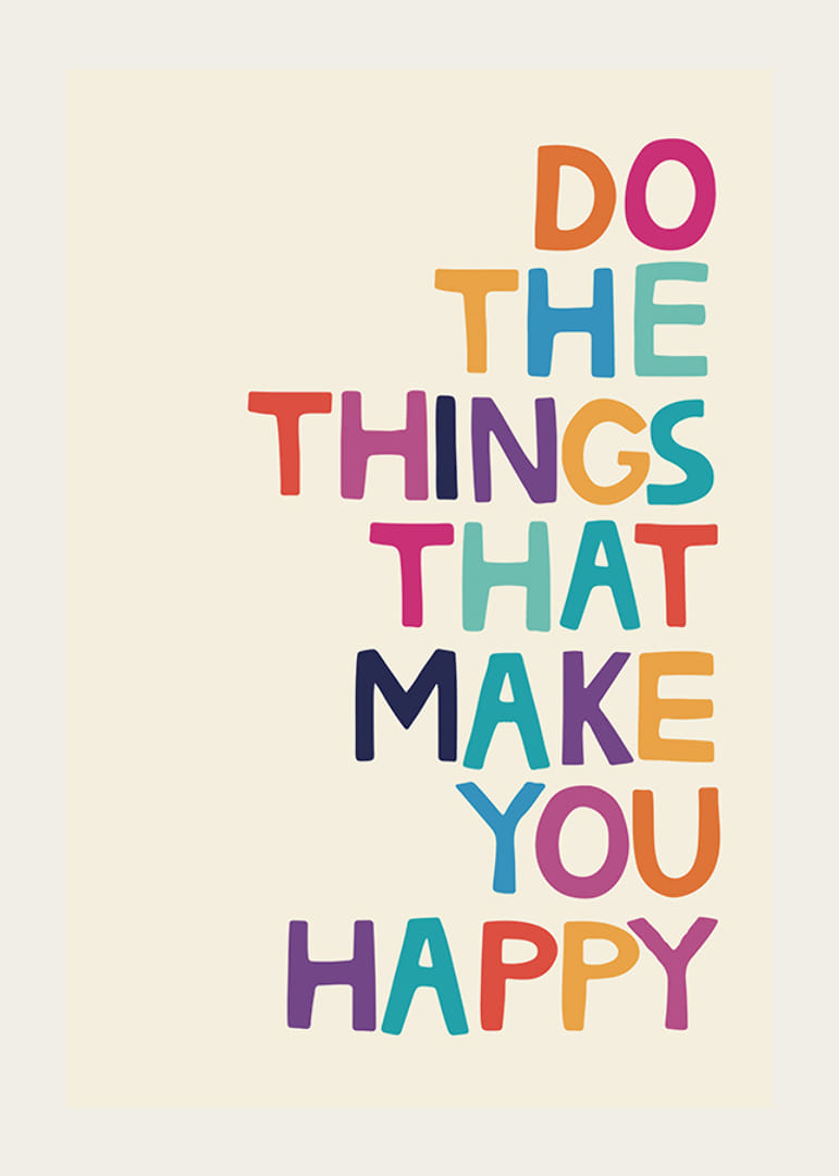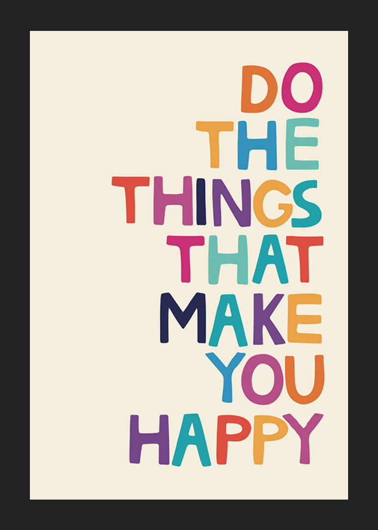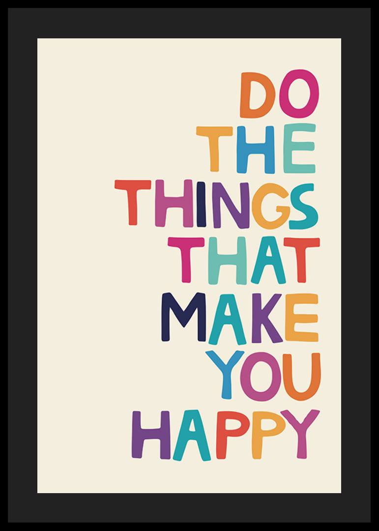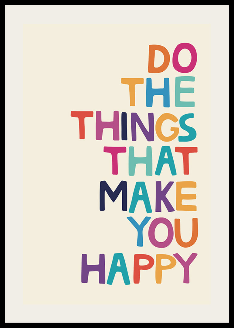 Duże litery w różnych kolorach tworzą zachęcający przekaz „Rób rzeczy, które sprawiają Ci radość” na ciepłym, piaskowym tle. Wesoły i przejrzysty styl doskonale pasuje do pokoi dziecięcych, bawialni i innych miejsc, w których chcesz poprawić sobie humor. Plakat wnosi energię i pozytywną atmosferę do wnętrza.