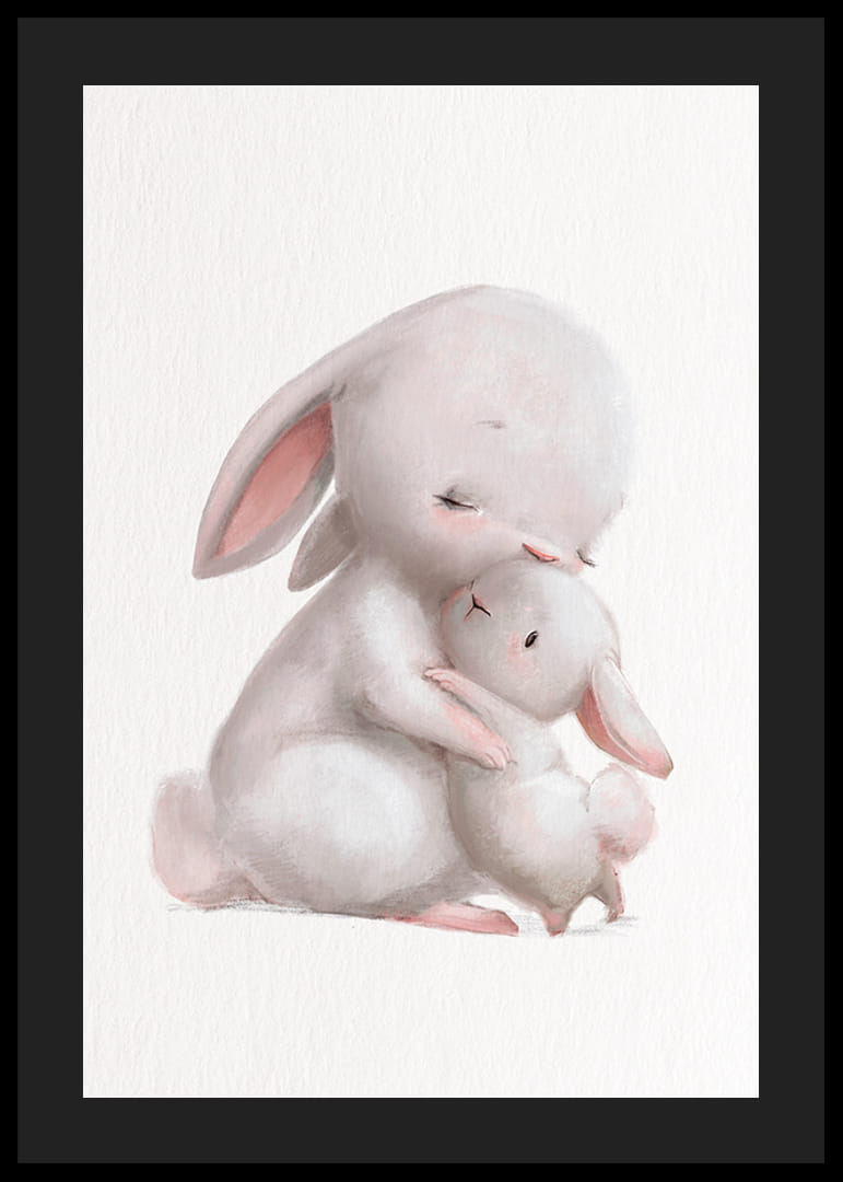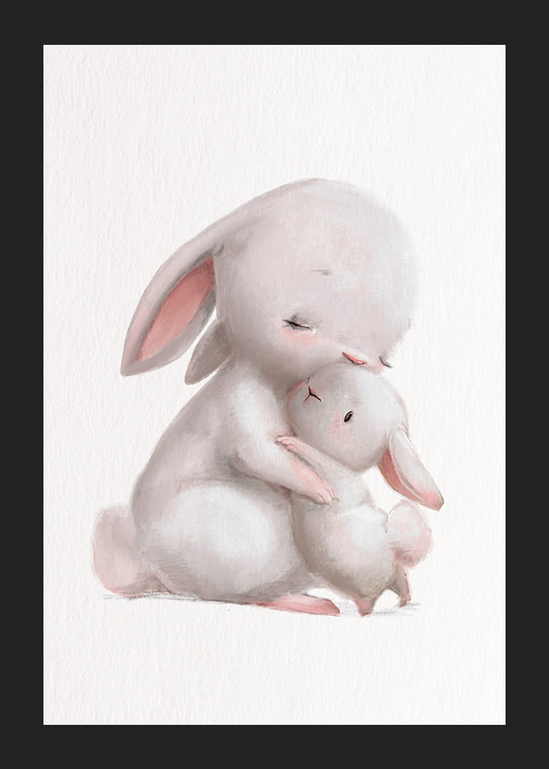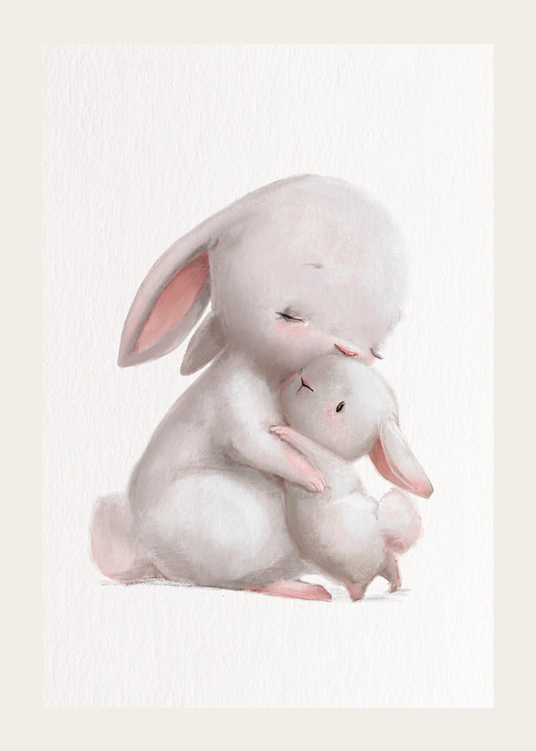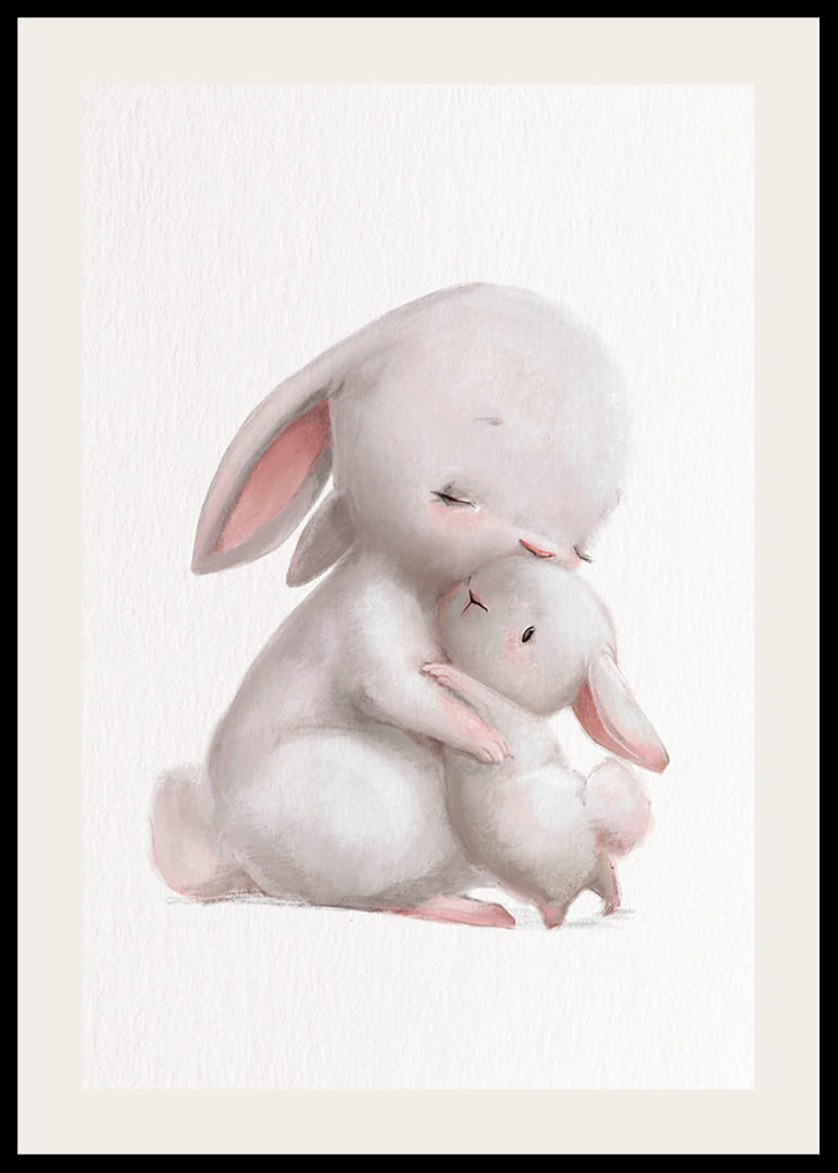 Dwa króliki siedzą blisko siebie w ciepłym uścisku. Delikatne, pastelowe barwy i prosta kompozycja ilustracji tworzą przyjazny nastrój na białym tle. Motyw idealnie wpisuje się w dziecięcy pokój i daje poczucie bezpieczeństwa. Plakat, który stanie się subtelnym elementem w osobistym otoczeniu dziecka.