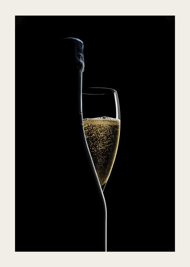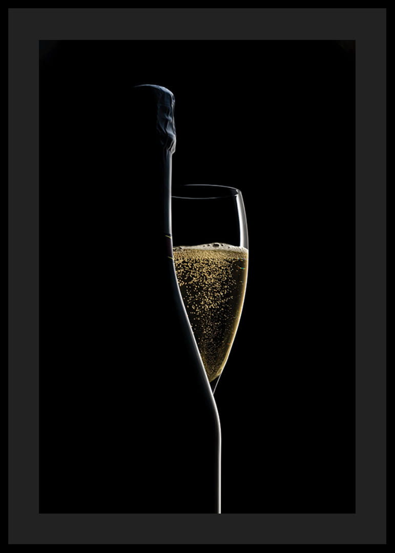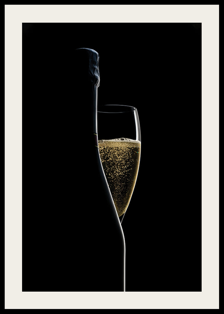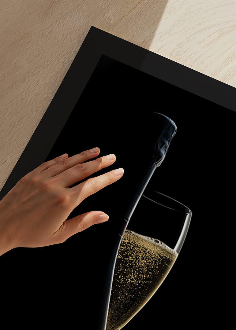 Motyw przedstawia wąski kieliszek do szampana wypełniony złotymi bąbelkami, częściowo przysłonięty sylwetką butelki. Głębokie czarne tło podkreśla jasne kontury i bąbelki. Stylowy i minimalistyczny wygląd sprawia, że ​​ten plakat będzie stonowanym elementem w kuchni, jadalni lub domowym barze.