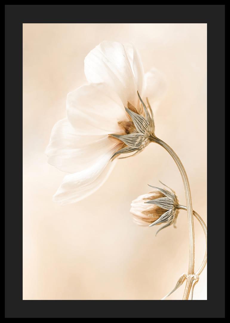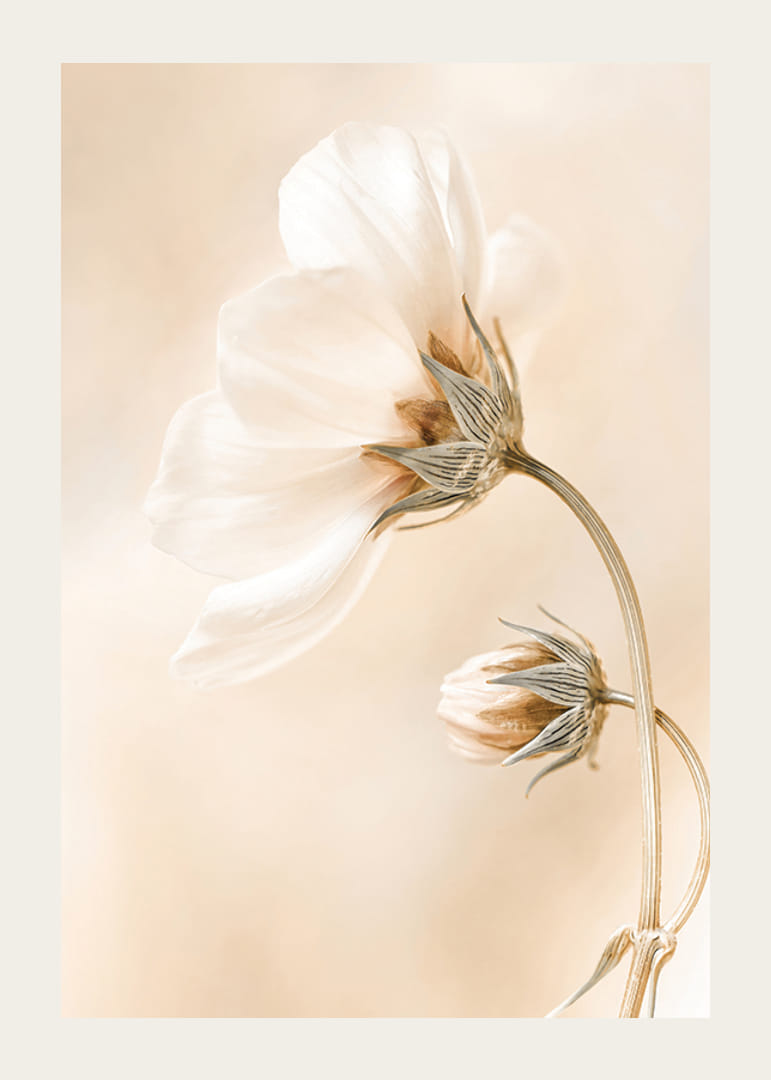 Zbliżenie białego kwiatu i pąka, oba z cienkimi łodygami i delikatnymi pręcikami. Jedwabiste płatki wyróżniają się na rozproszonym, beżowym tle o ciepłej tonacji. Botaniczny plakat, który doda Twojemu domowi delikatnego, naturalnego charakteru i świetnie sprawdzi się w salonie lub sypialni.