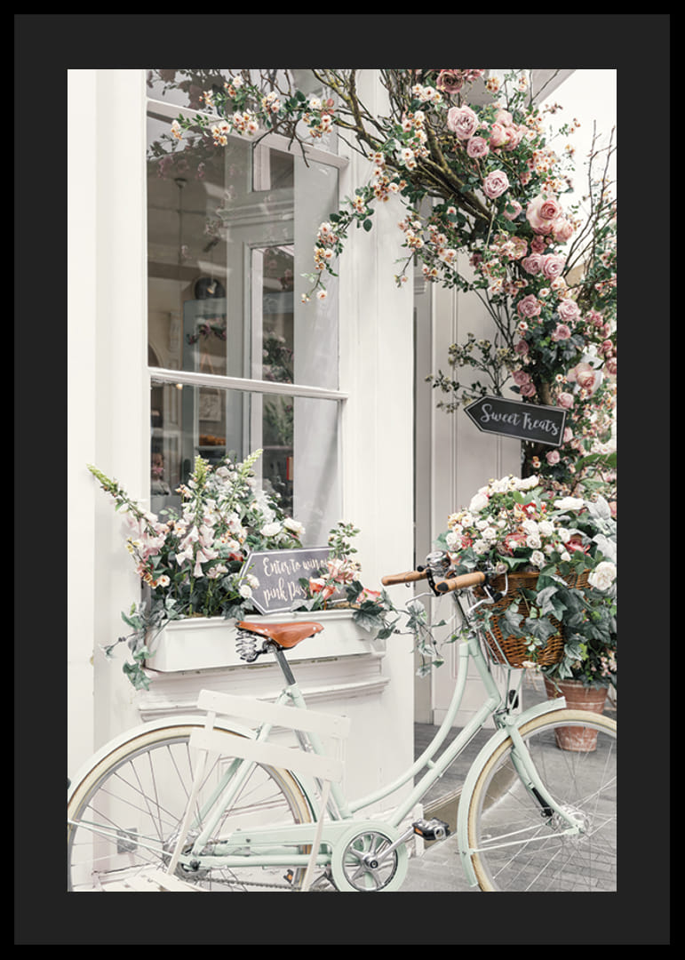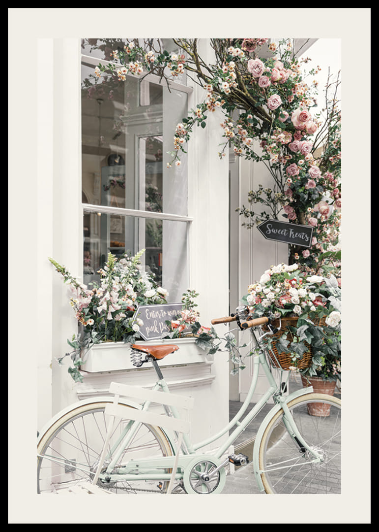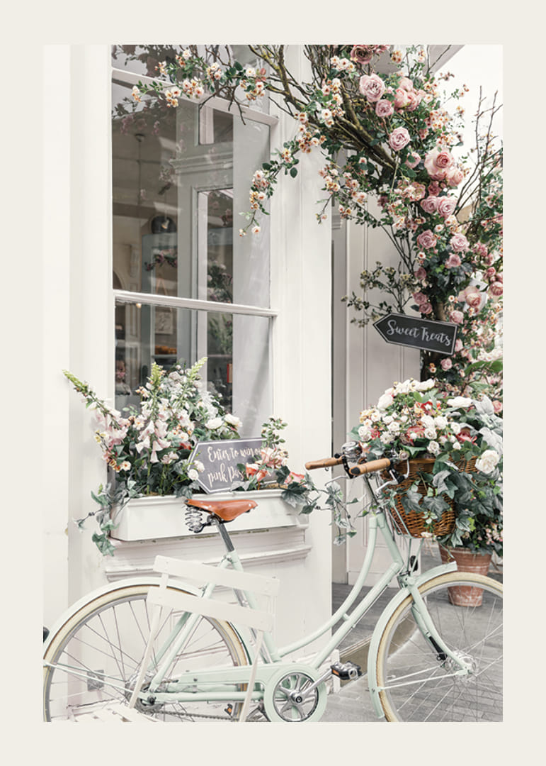 Plakat z motywem wiejskiego roweru w jasnych pastelowych barwach, zaparkowanego obok fasady sklepu ozdobionej licznymi kompozycjami z róż i innych kwiatów w delikatnych odcieniach różu i bieli. Kwiatowy blask obramowany jest gałęziami i ręcznie malowanym szyldem, nadając motywowi miejski charakter z botanicznym urokiem. Ten plakat idealnie nadaje się do kuchni, przedpokoju lub salonu.