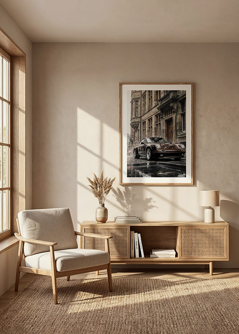 Czarne Porsche 911 zaparkowane jest obok okazałego budynku z wysokimi, kamiennymi łukami i misterną fasadą w stonowanych barwach. Elegancki design samochodu doskonale komponuje się z klasycznym motywem architektonicznym w tle. Ten plakat nadaje ponadczasowy, miejski charakter gabinetowi, korytarzowi lub salonowi.