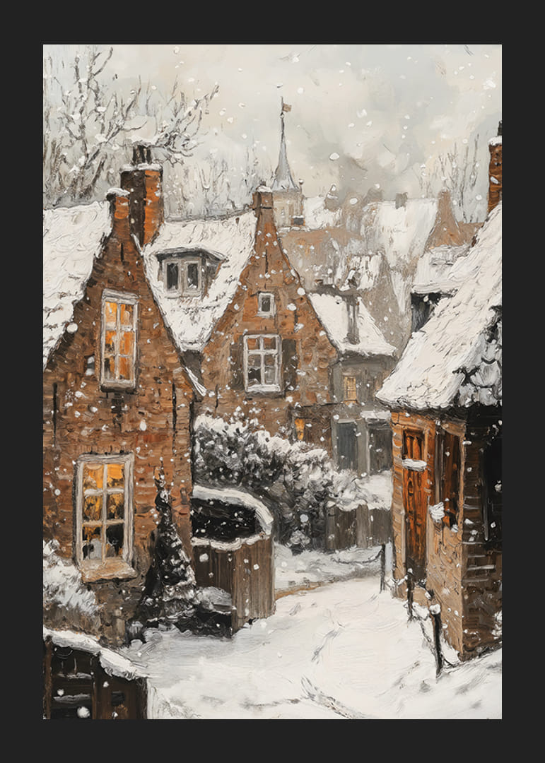 Brązowe, kamienne domy z pokrytymi śniegiem dachami i ciepłym światłem w oknach tworzą nastrojowy, zimowy krajobraz. Duże płatki śniegu opadają na wąską uliczkę, a nagie gałęzie drzew stanowią ramę sceny. Ten plakat emanuje spokojem i poczuciem wspólnoty, szczególnie nadając się do salonu lub przedpokoju zimą.