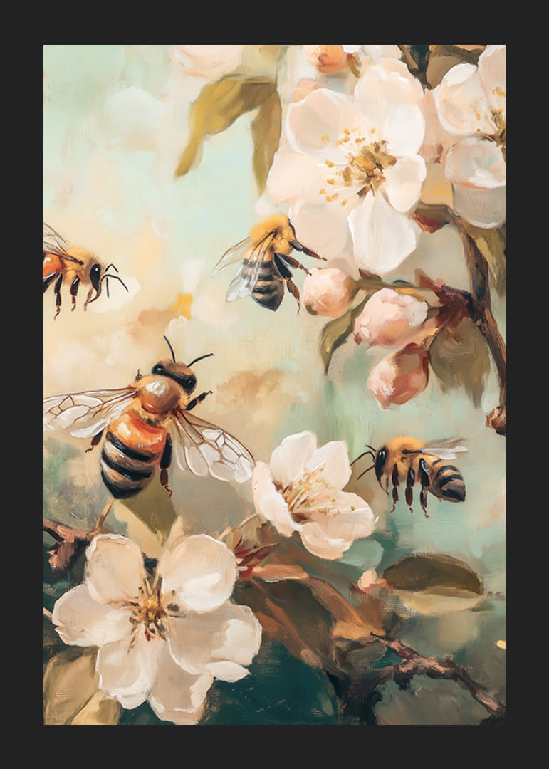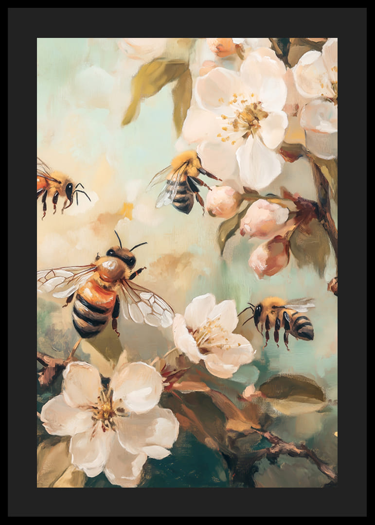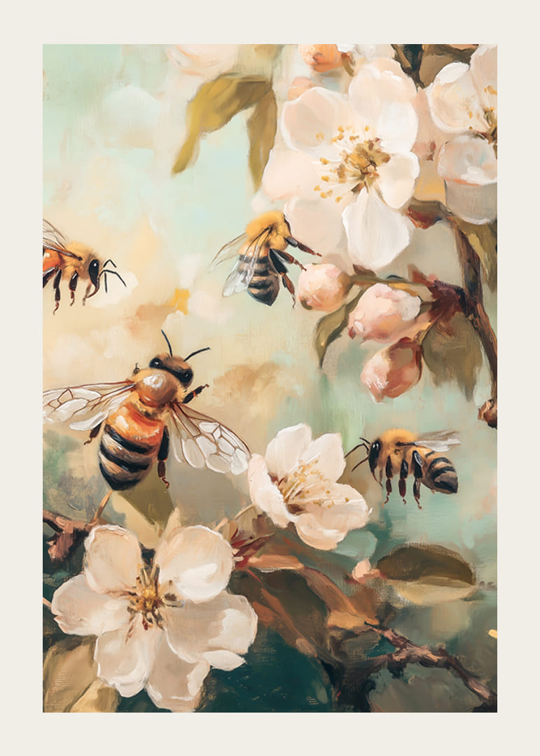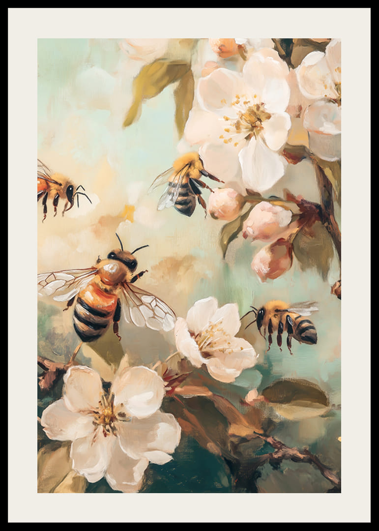 Na tym plakacie kilka pszczół gromadzi się wśród białych kwiatów jabłoni i zielonych liści na stonowanym tle. Dokładne pociągnięcia pędzla nadają artystyczny charakter, a dominujące pastelowe tony podkreślają wiosenną atmosferę. Plakat idealnie nadaje się do pomieszczeń, w których chcesz dodać odrobinę życia i natury.