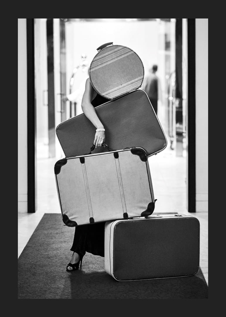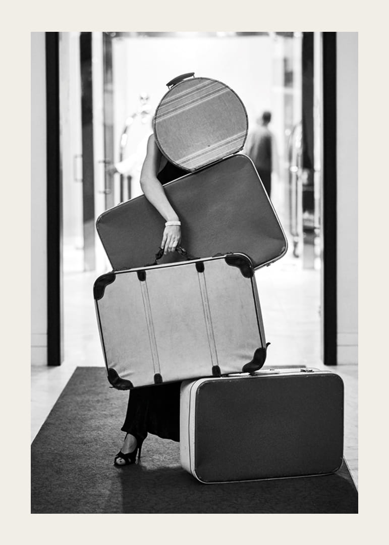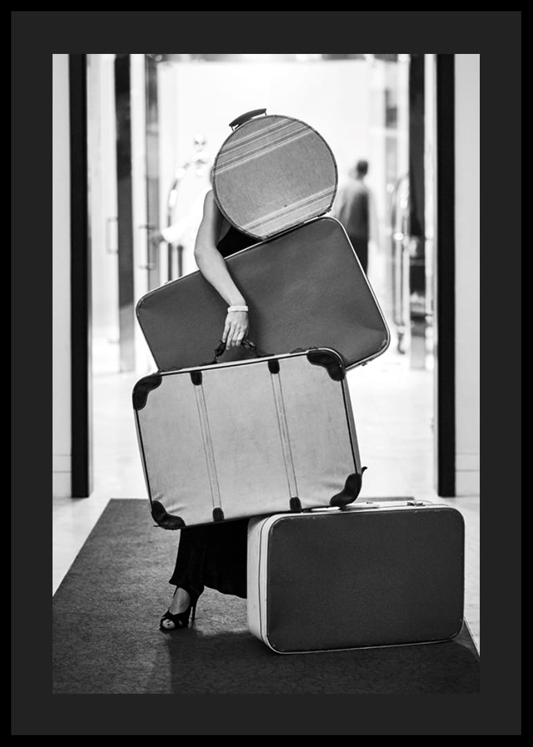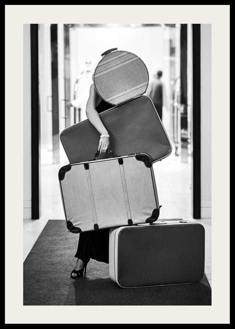 Kobieta ubrana na czarno balansuje na czterech torbach vintage o różnych rozmiarach w hotelowym lub podróżniczym otoczeniu. Czarno-białe zdjęcie oddaje klimat retro i podróżniczy klimat, z wyraźnymi kontrastami i klasycznymi kształtami. Plakat doskonale sprawdzi się w przedpokoju lub salonie, gdzie ceniony jest radosny i nostalgiczny ton.