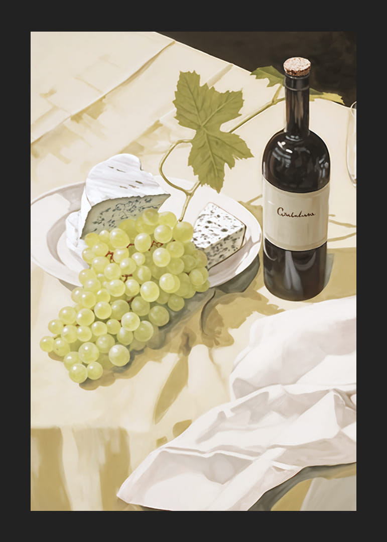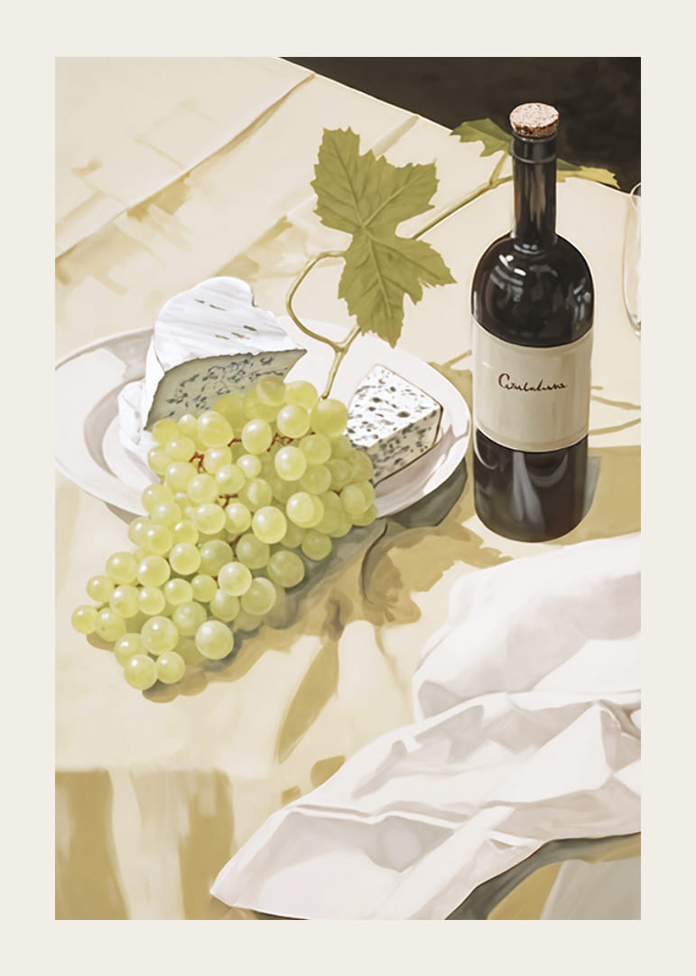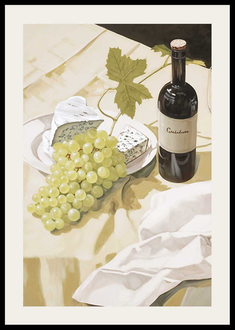 Motyw przedstawia kiść zielonych winogron, dwa rodzaje sera i butelkę ciemnego wina ułożoną na jasnożółtym obrusie. Cienie i łagodne przejścia kolorystyczne tworzą ciepłą i przyjazną atmosferę. Ten plakat idealnie nadaje się do kuchni lub jadalni, nadając subtelny styl inspirowany klasycznymi martwymi naturami.
