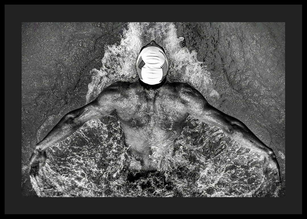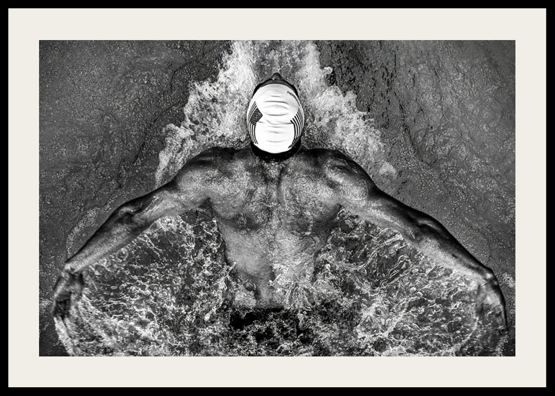 Czarno-biały plakat ze zdjęciem Michaela Phelpsa ze Stanów Zjednoczonych podczas prób na Mistrzostwach Świata w pływaniu w Rzymie we Włoszech w 2009 roku, gdzie zdobył pięć złotych i jedno srebro. Phelps jest najbardziej utytułowanym olimpijczykiem wszechczasów. Podczas swojej imponującej kariery olimpijskiej zdobył łącznie 23 złote, 3 srebrne i 2 brązowe medale na igrzyskach w latach 2004, 2008, 2012 i 2016.