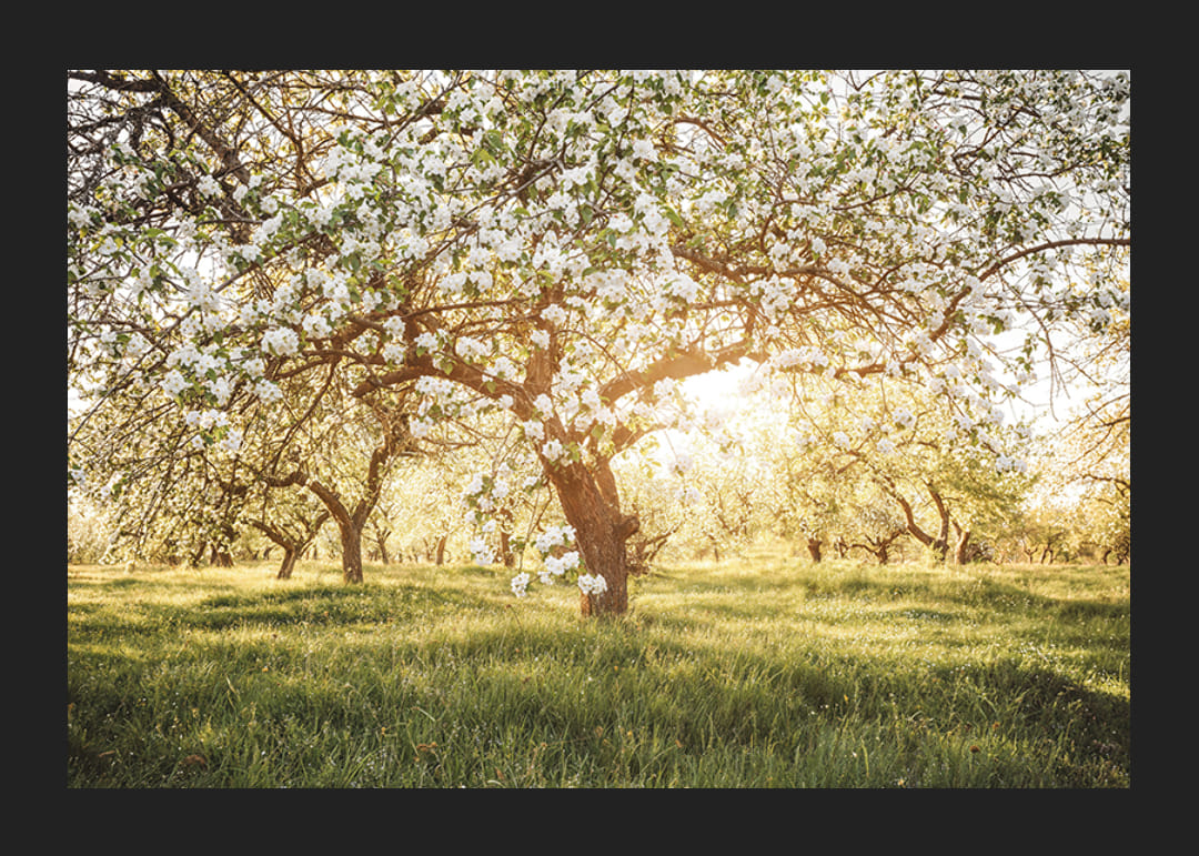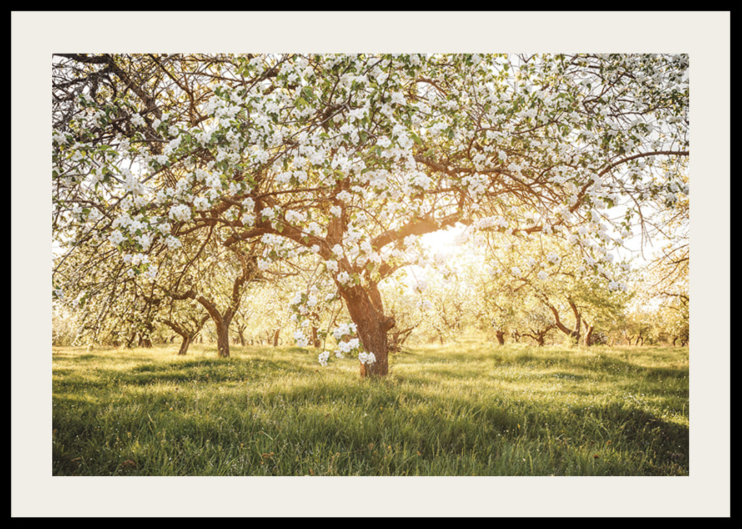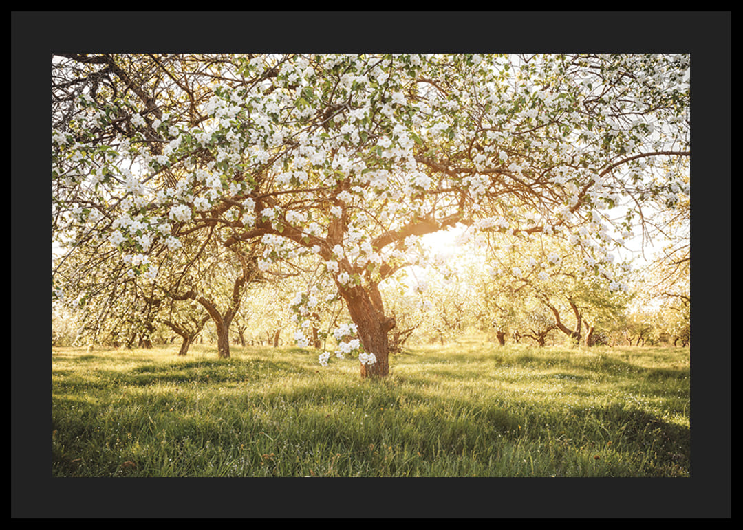 Stwórz poczucie wiosny i odnowy dzięki temu czarującemu plakatowi. Kwitnący sad skąpany jest w delikatnym świetle słonecznym, tworząc atmosferę spokoju i naturalnego piękna. Idealny do przekształcenia domu w oazę harmonii i spokoju.