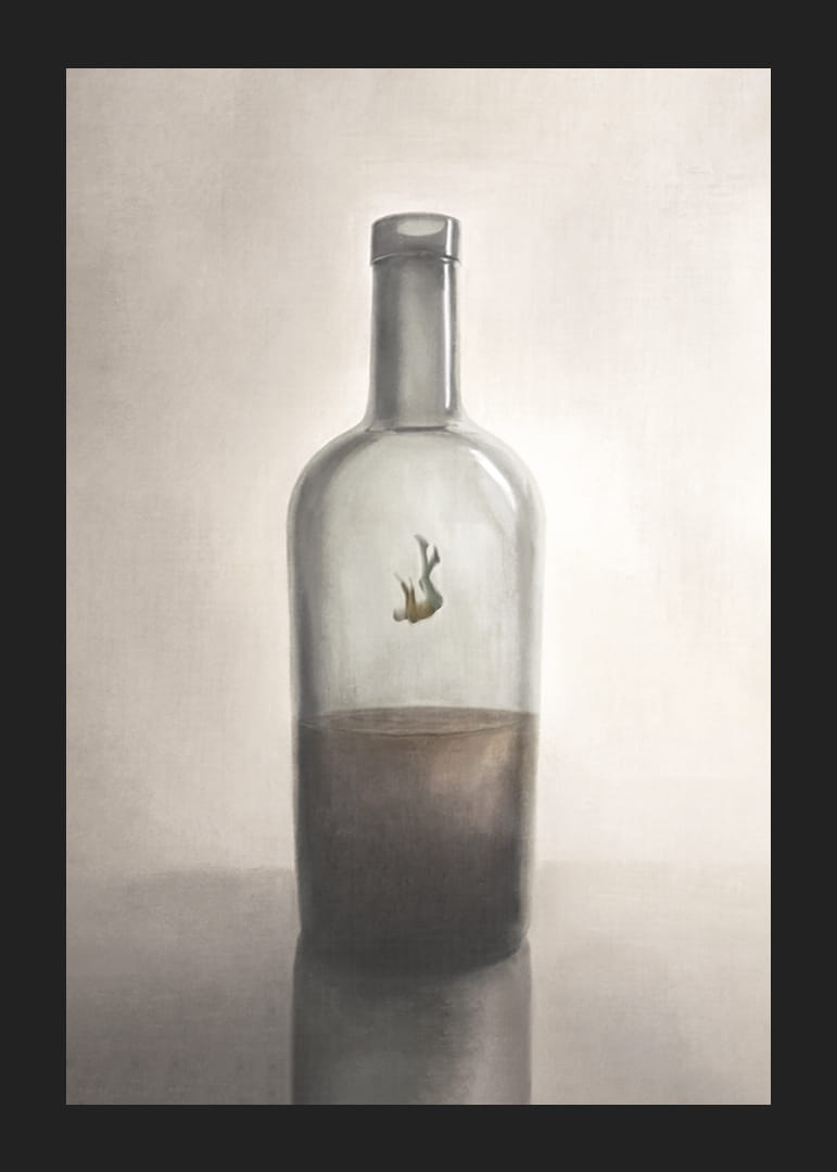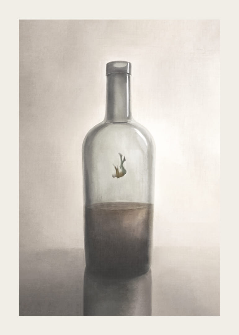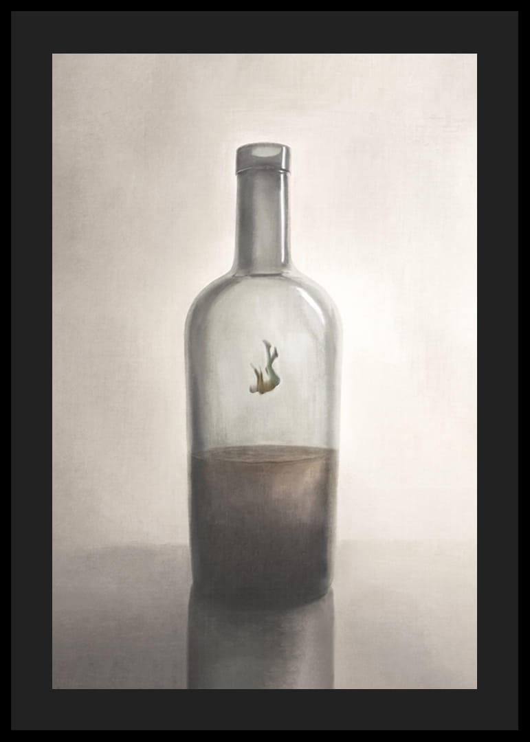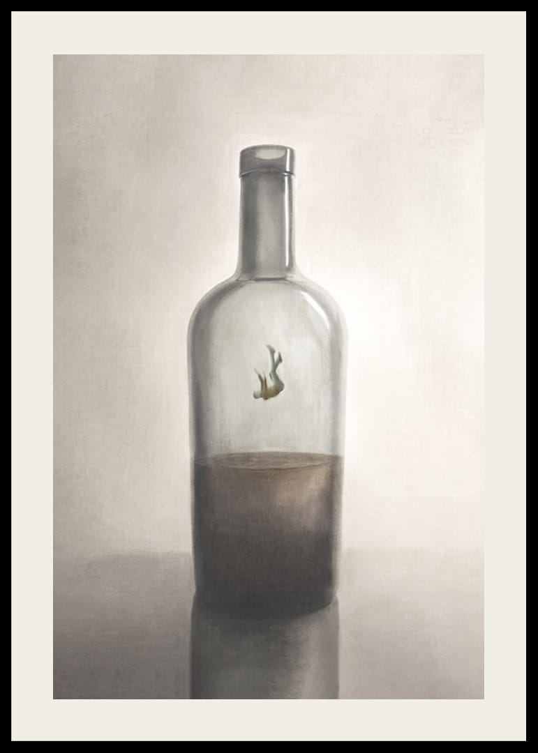 Odkryj uczucie wewnętrznej refleksji dzięki temu sugestywnemu plakatowi. Obraz przedstawia postać uwięzioną w szklanej butelce, jakby unoszącą się pomiędzy rzeczywistością a snem, symbolizującą poczucie izolacji i introspekcji. Idealny dla tych, którzy szukają skłaniającego do refleksji detalu wnętrza, który rodzi pytania o wolność, ograniczenia i głębię duszy. Subtelne dzieło sztuki z silną symboliką i emocjami.