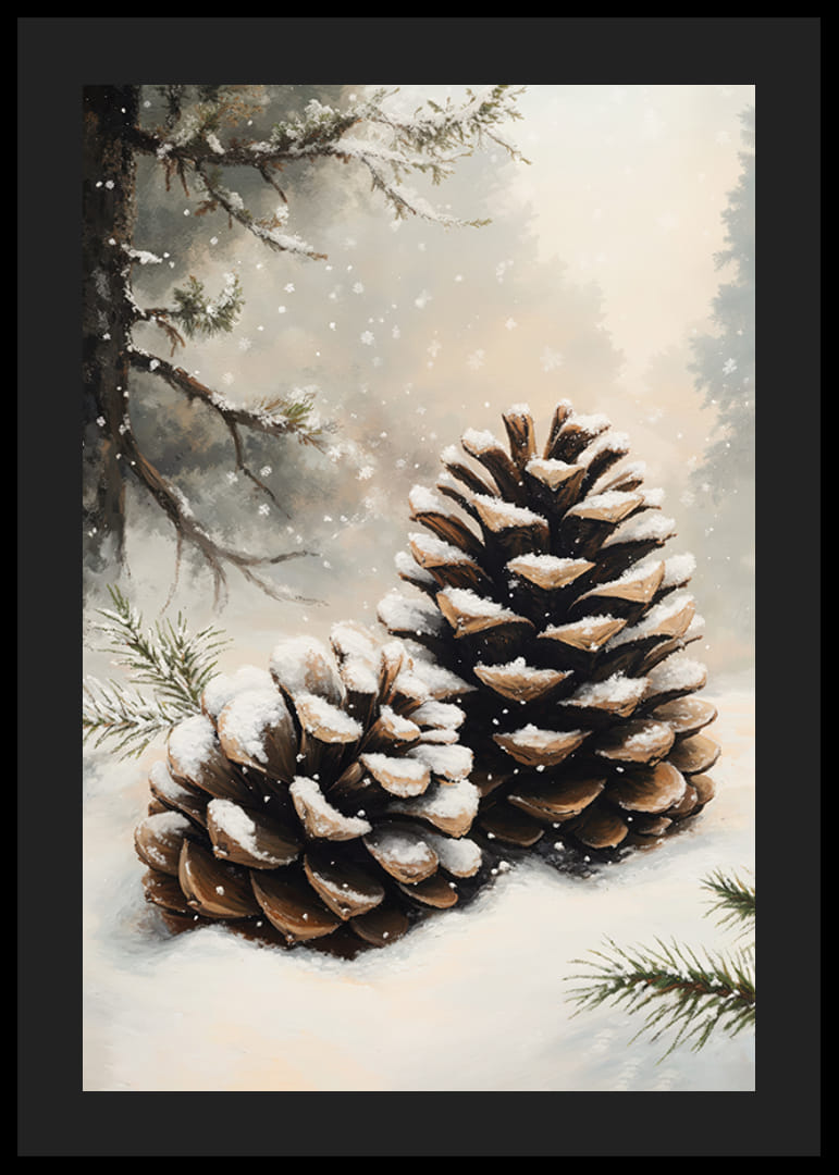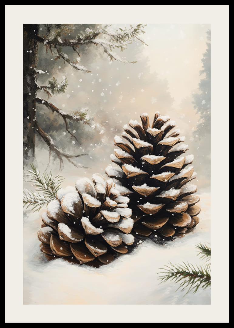 Ten plakat oddaje ciszę lasu za pomocą dwóch dużych stożków pokrytych warstwą błyszczącego śniegu, otoczonych miękkimi gałęziami w mroźnym krajobrazie. Obraz emanuje prostym i naturalnym pięknem, przypominającym spokojny urok i magię zimy. Idealny do stworzenia w domu uspokajającej i przyziemnej atmosfery – hołd złożony drobnym szczegółom natury i spokojnym chwilom zimy.