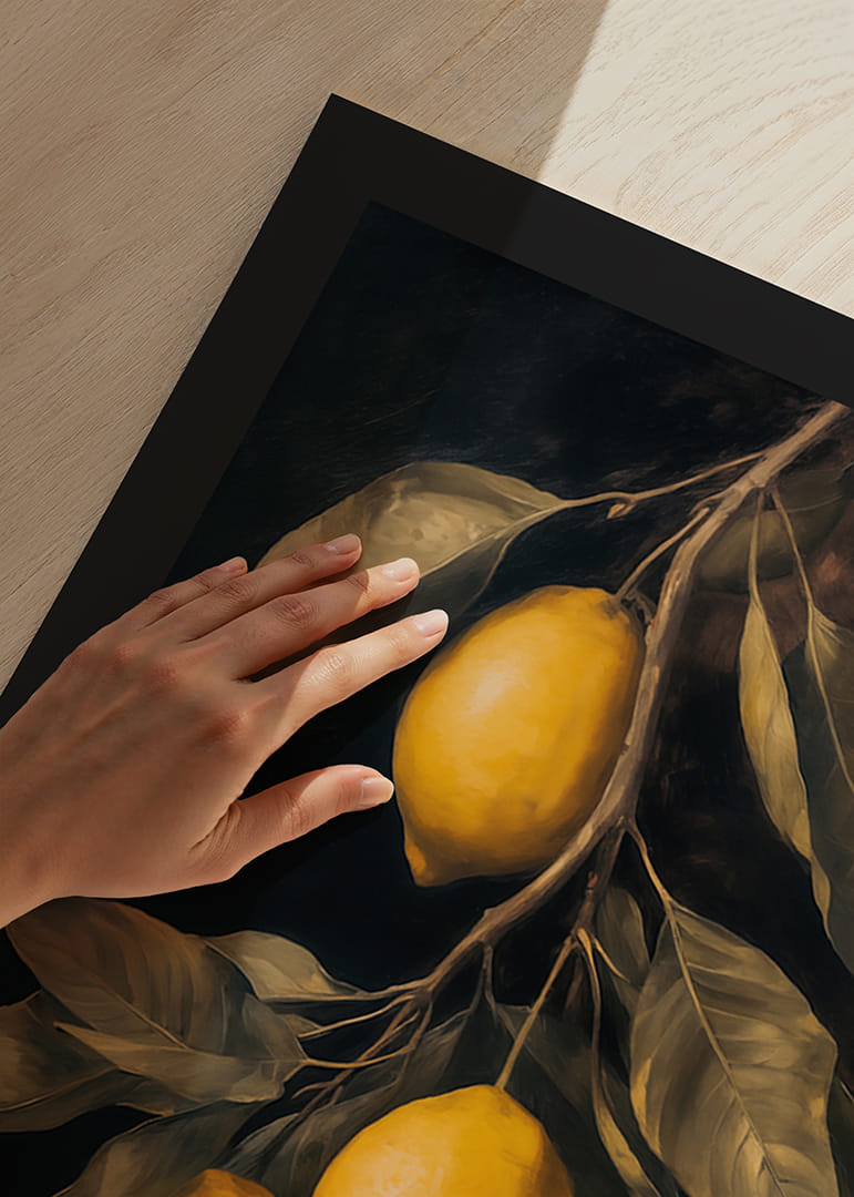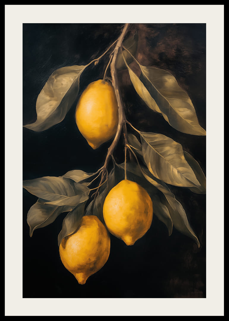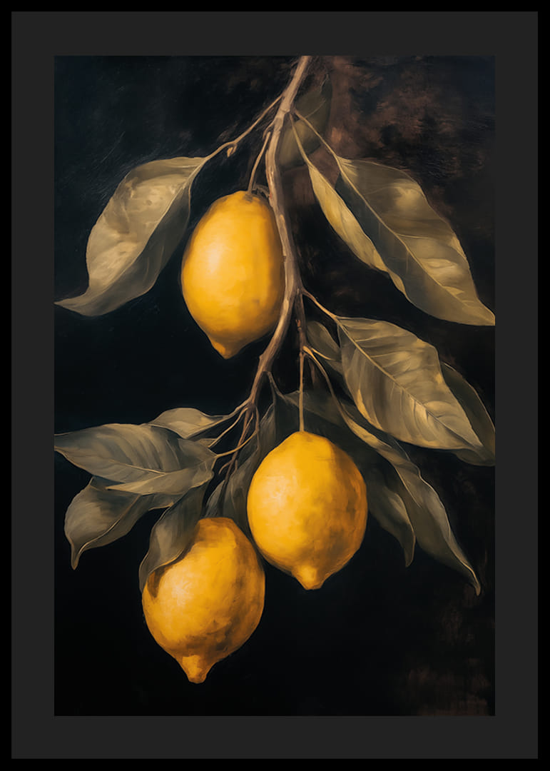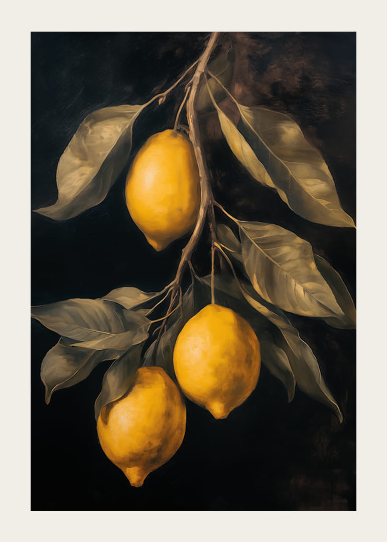 Ten elegancki plakat oddaje poczucie rustykalnego piękna dzięki złotożółtym cytrynom na dramatycznym ciemnym tle. Idealny, aby dodać odrobinę śródziemnomorskiej inspiracji do Twojej kuchni lub salonu. Dzięki szczegółowym pociągnięciom pędzla i harmonijnym kolorom tworzy wyrafinowaną i ciepłą atmosferę, idealną do podniesienia poziomu każdego pomieszczenia